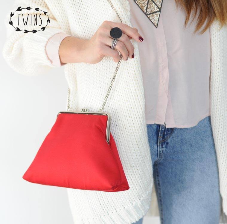 Mała, elegancka, prosta torebka zapinana na metalowe, srebrne zapięcie. Wykonana z czerwonej bawełnianej tkaniny. W środku podszewka.(prosimy pytać o kolor w aktualnej kolekcji). Torebka zaopatrzona jest w łańcuszek do zakładania przez głowę i jest usztywniana. Wszystkie torebki powstają w naszej pracowni i są zaopatrzone w metkę z naszym logo.