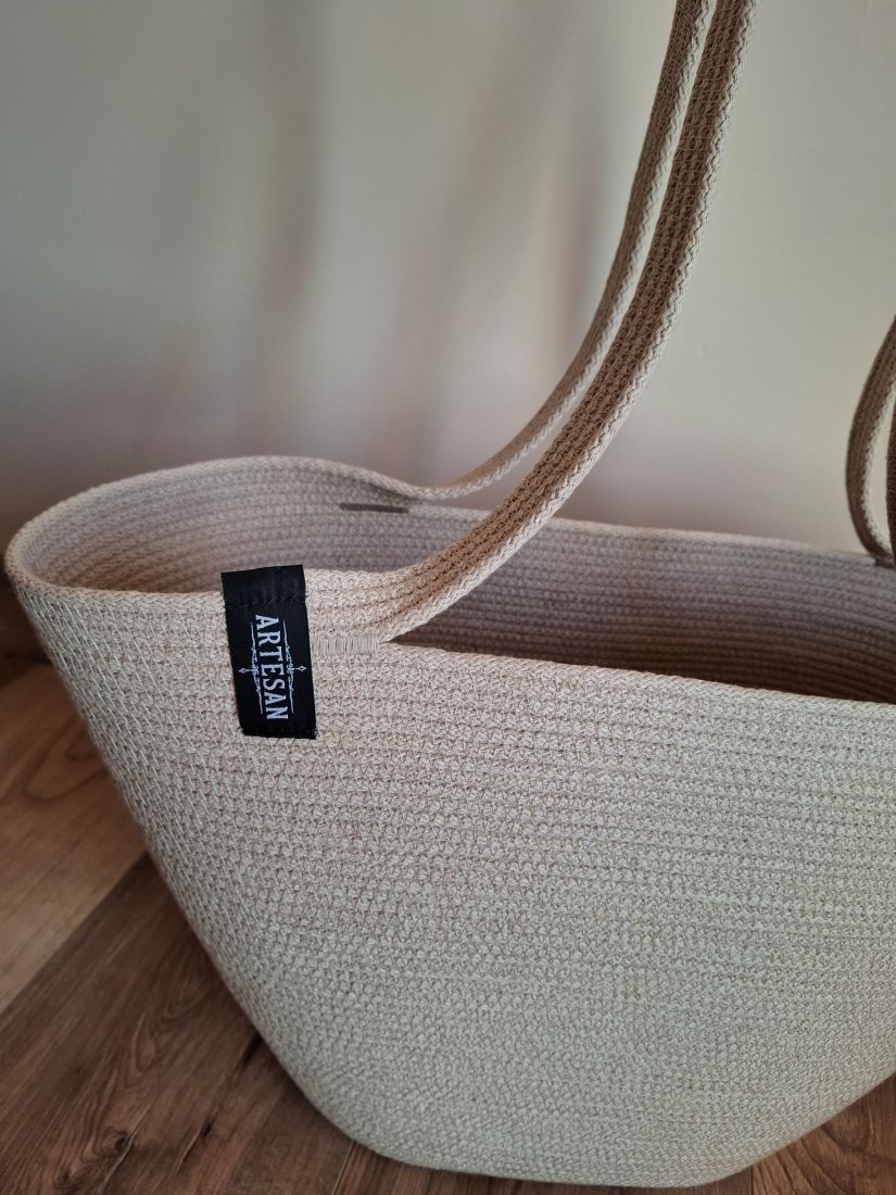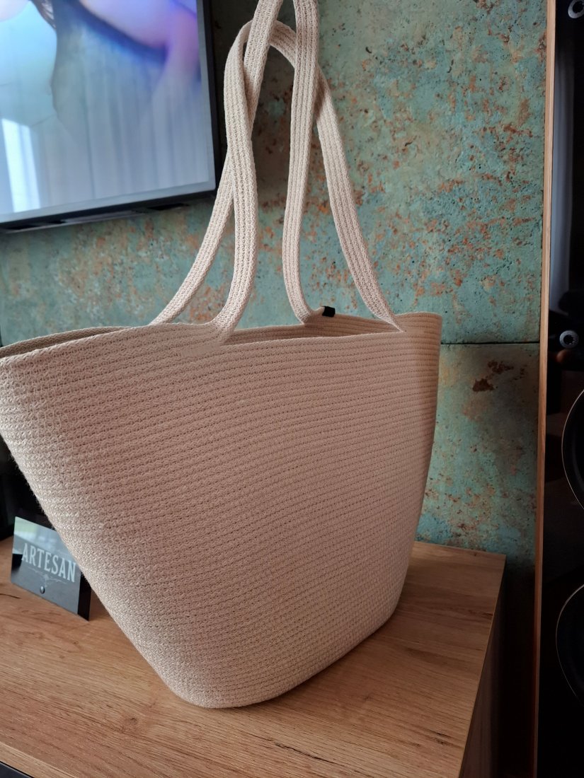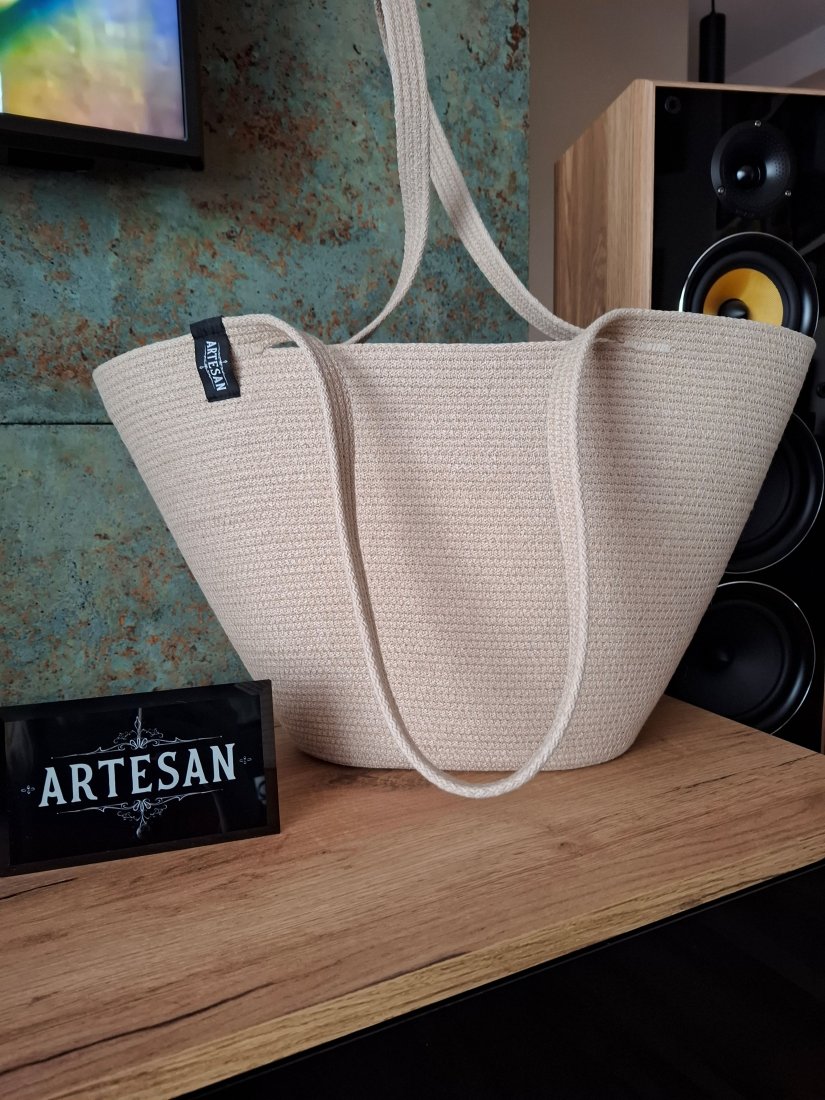 Torebka damska wykonana ze sznurka bawełnianego w kolorze beżowym, nadaje jej przyjemny i naturalny wygląd, torebka ma prosty ale stylowy design, doskonała na zakupy lub na co dzień. Idealnie sprawdzi się w casualowych stylizacjach.