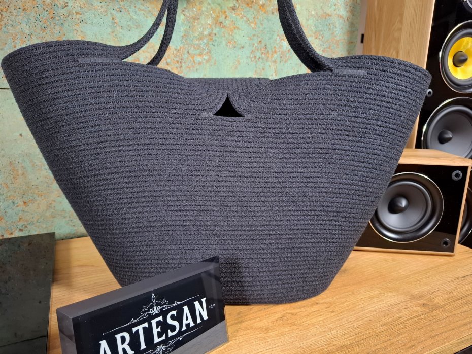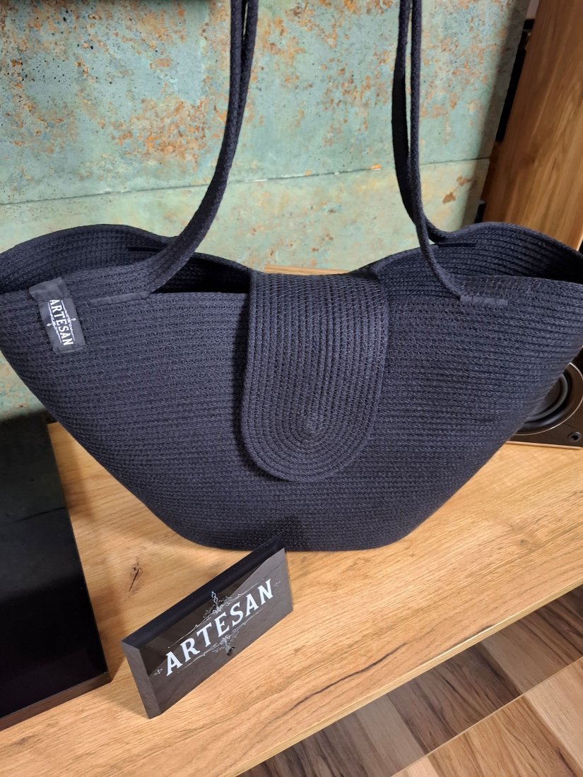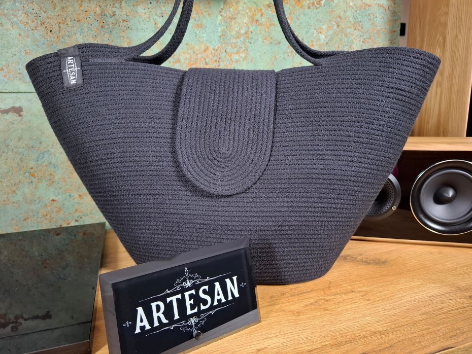 Torebka damska wykonana ze sznurka bawełnianego w kolorze czarnym klasycznym, dodatkowo posiada klapkę szytą łącznie z torebką z zapięciem magnetycznym co nadaje jej przyjemny i naturalny wygląd, torebka ma prosty ale stylowy design, doskonała na zakupy lub na co dzień. Idealnie sprawdzi się w casualowych stylizacjach.