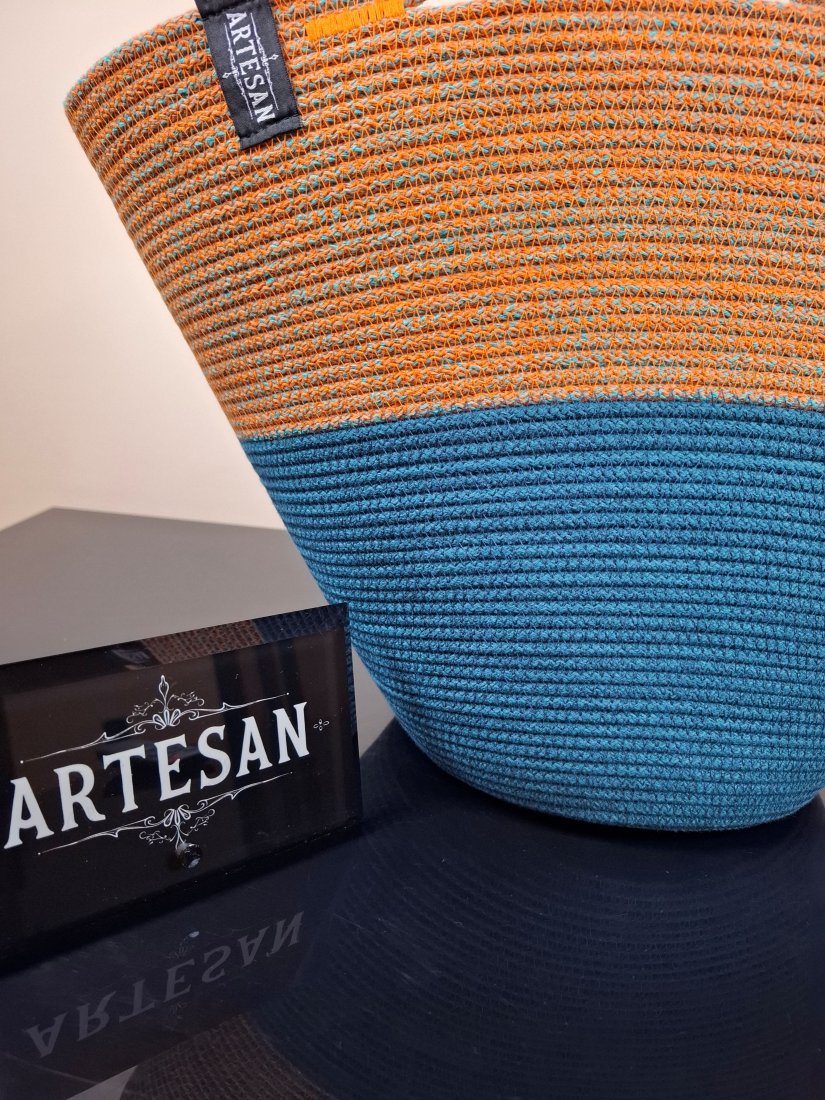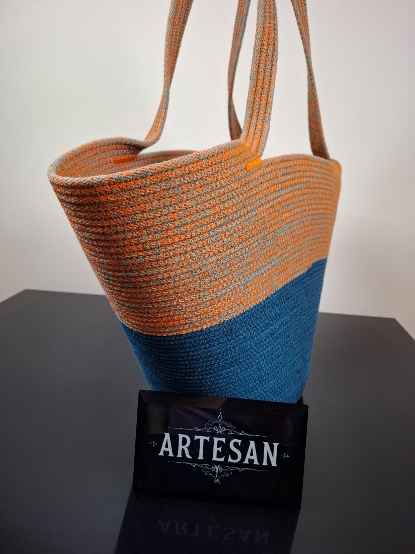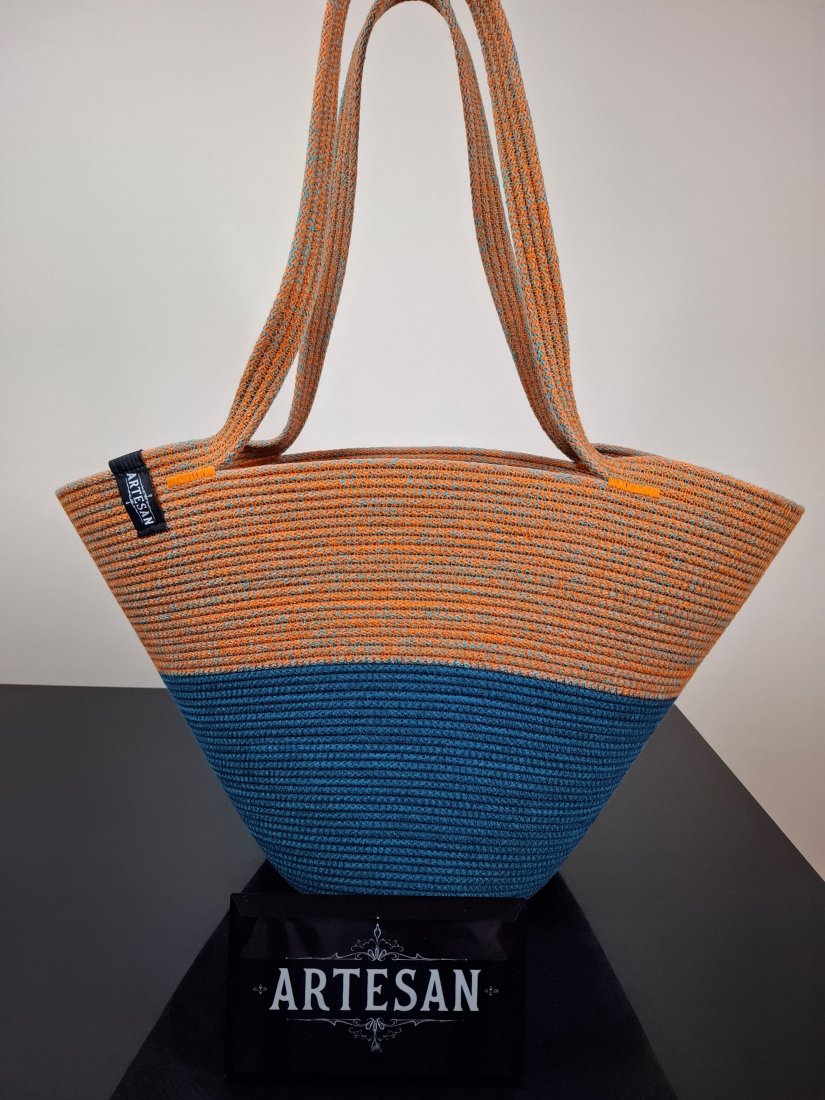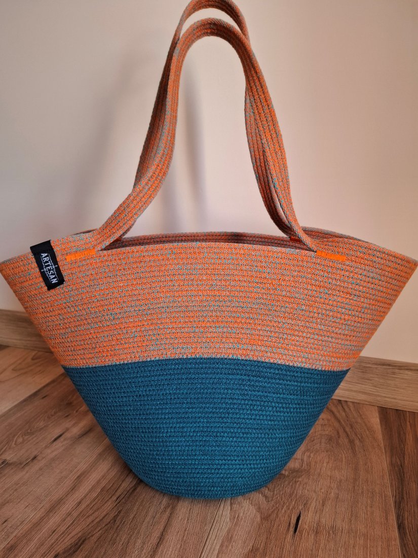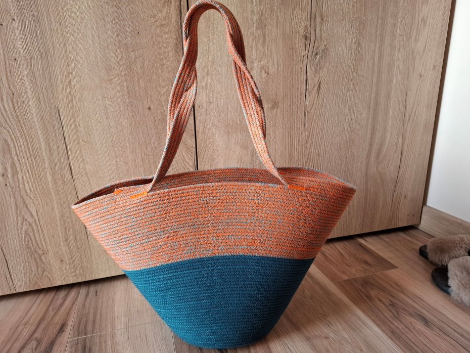 Torebka damska wykonana ze sznurka bawełnianego w kolorach melanż pomarańczy z lazurowym połączony z morskim , torebka ma prosty ale stylowy design, doskonała na zakupy lub na co dzień. Idealnie sprawdzi się w casualowych stylizacjach.