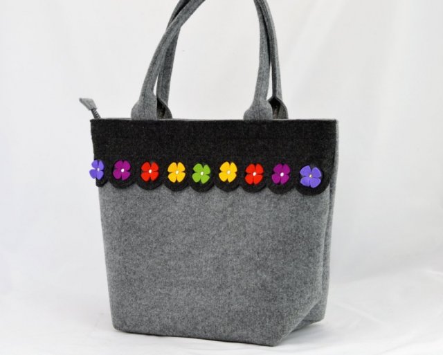 Torebka została wykonana z grubego, mocnego, impregnowanego filcu. Prosta forma torebki została ozdobiona kolorowymi, ręcznie wycinanymi kwiatkami z filcu wełnianego. Kwiatki są przynitowane do torebki. Kuferek jest bardzo uroczy i solidnie wykonany! Szerokość torebki - w najszerszym miejscu około 41 cm (góra), 32cm (na dole), wysokość około 31 cm, głębokość na dole około 16 cm. Torebka została wykonana z dbałością o każdy szczegół w środku ładna podszewka - pasująca do torebki z 2 kieszonkami- na telefon i inne drobiazgi. Z tyłu torebki znajduje się bardzo duża kieszonka na suwak. Torebka zamykana jest od góry na suwak. Oba suwaki zostały wykończone filcowymi kwiatkami. Torebka jest bardzo pojemna - spokojnie mieści format A4. Rączki torebki zostały dodatkowo wzmocnione taśmą - są bardzo mocne. Długość rączek - około 54cm. Gorąco polecam!
