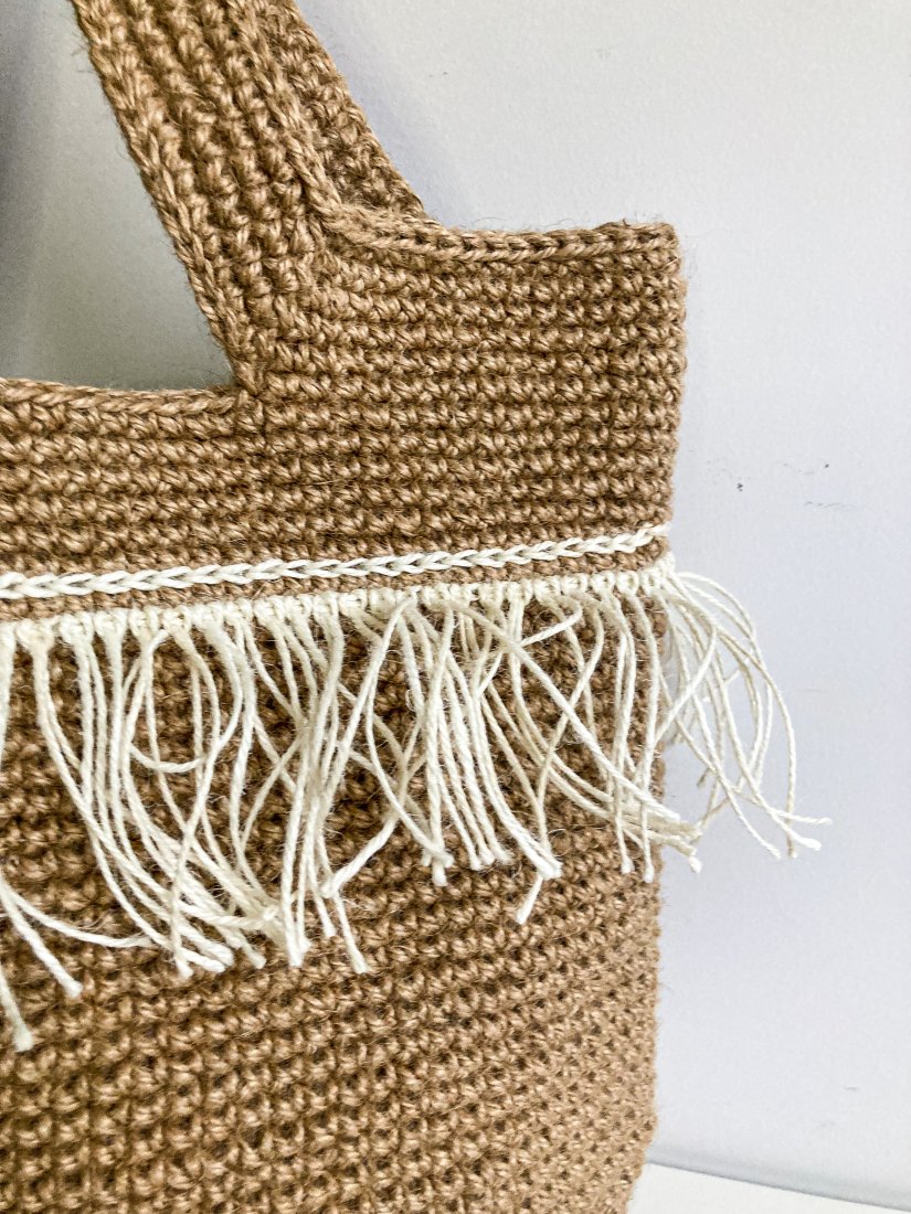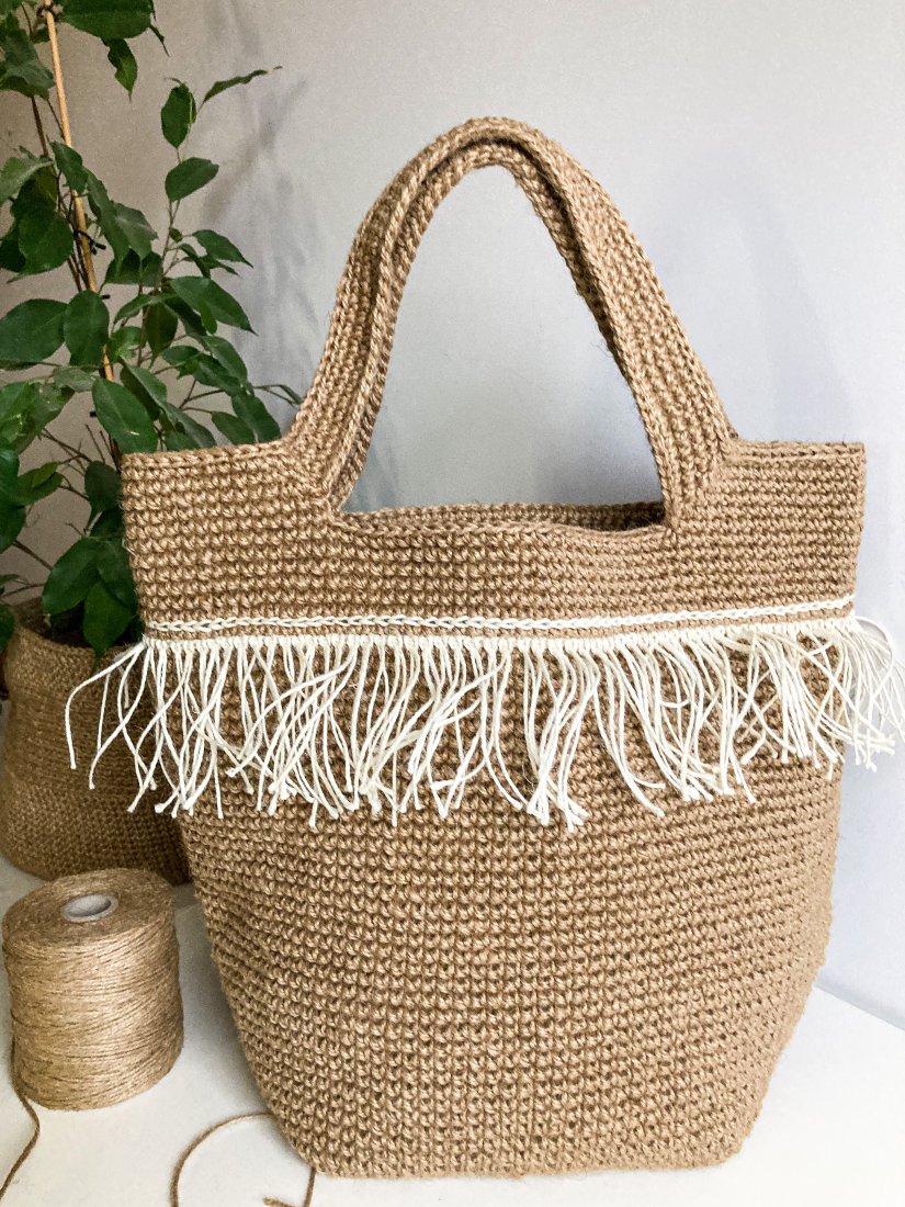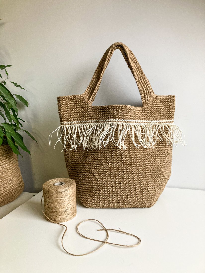 Stylowa, ręcznie wykonana torebka z naturalnej juty w klimacie boho. Naturalny kolor, miękka forma i dekoracyjne frędzle nadają jej wyjątkowego charakteru.