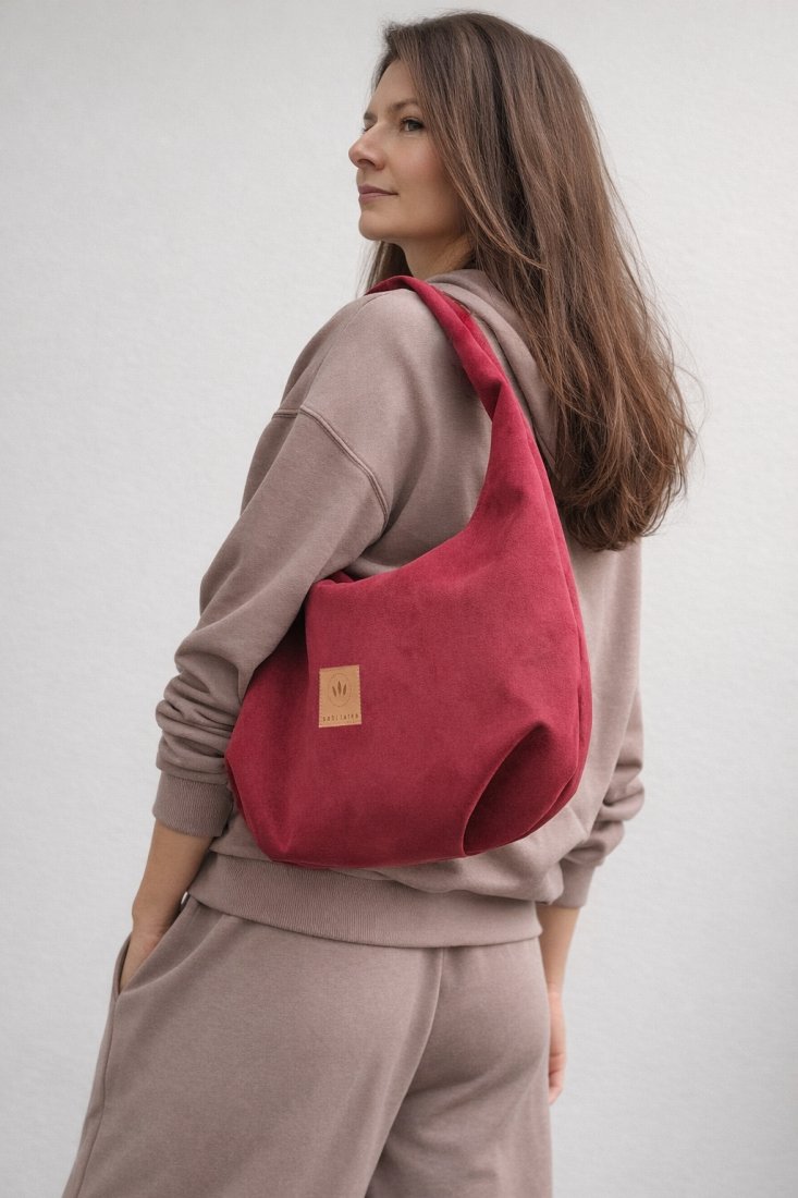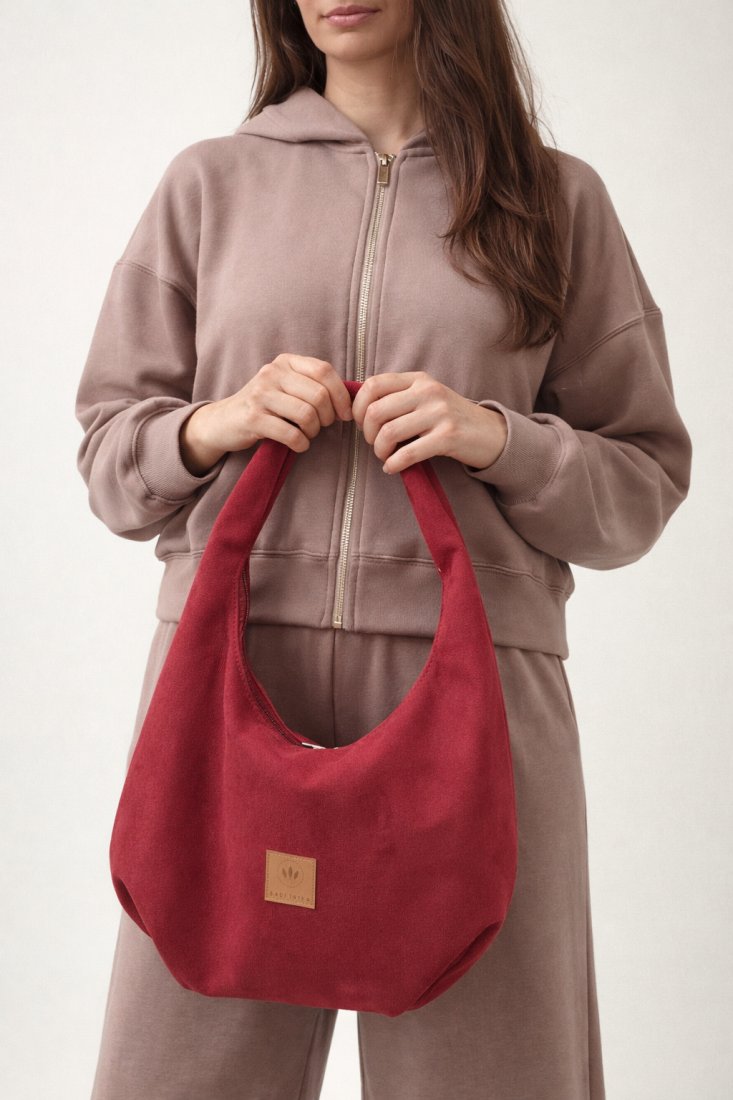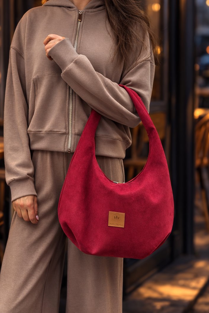 Elegancka torba typu hobo o zamszowej, przyjemnej w dotyku fakturze w kolorze zgaszonej czerwieni.