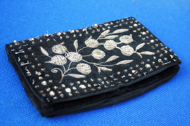 Kopertówka, czarny usztywniany aksamit, brak kilku koralikow, 20 cm x 12 cm