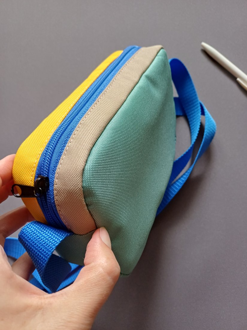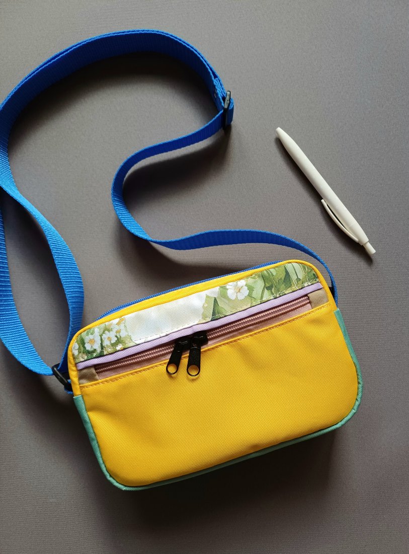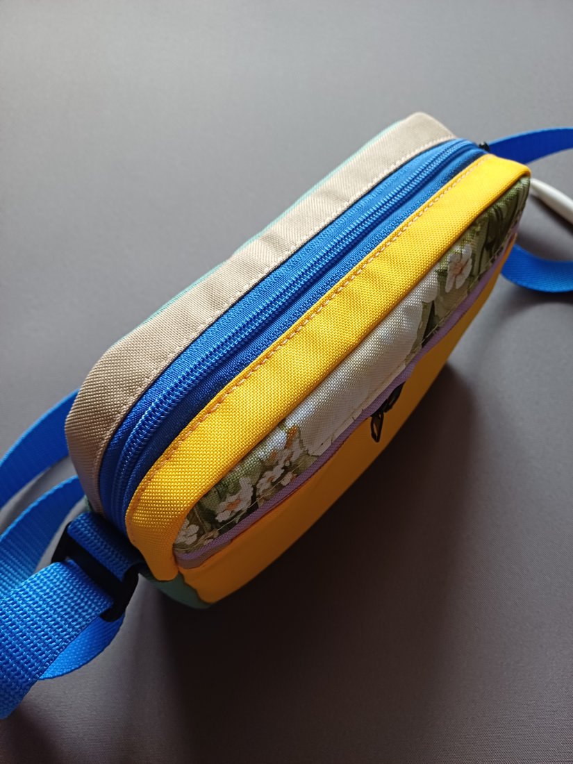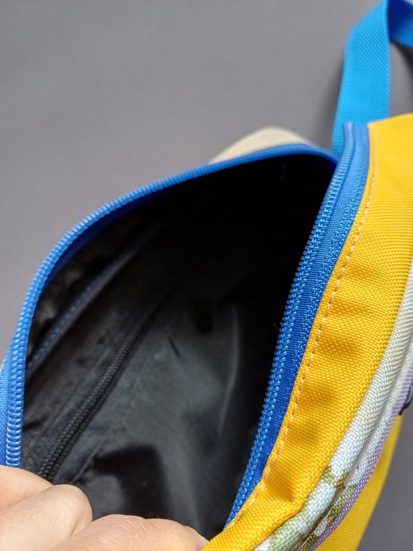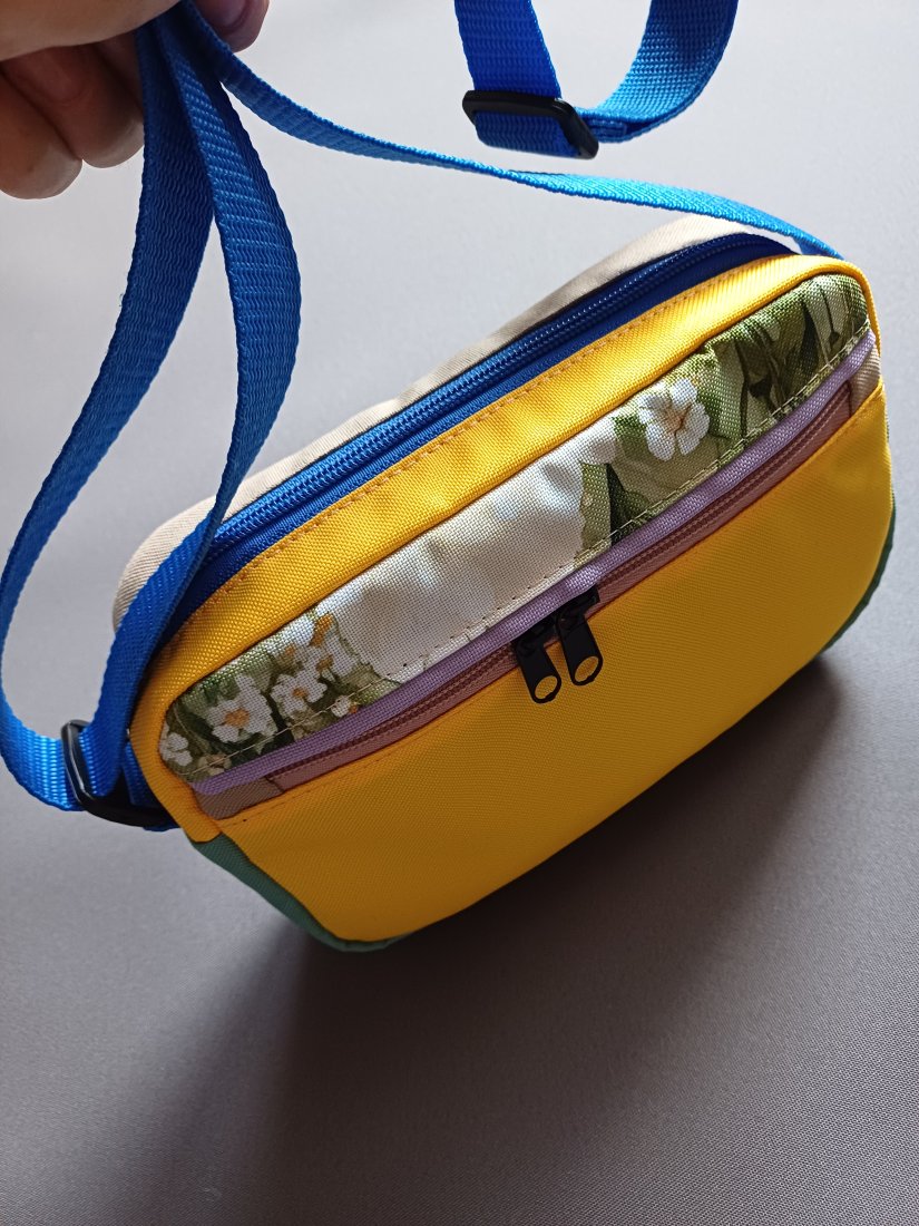 Torebka z tkanin wodoodpornych w kolorach: żółtym, oliwkowym, beżowym i niebieskim. W środku i na zewnątrz kieszonki zapinane na suwak. Pojemna,zmiesci telefon i przydaśki.