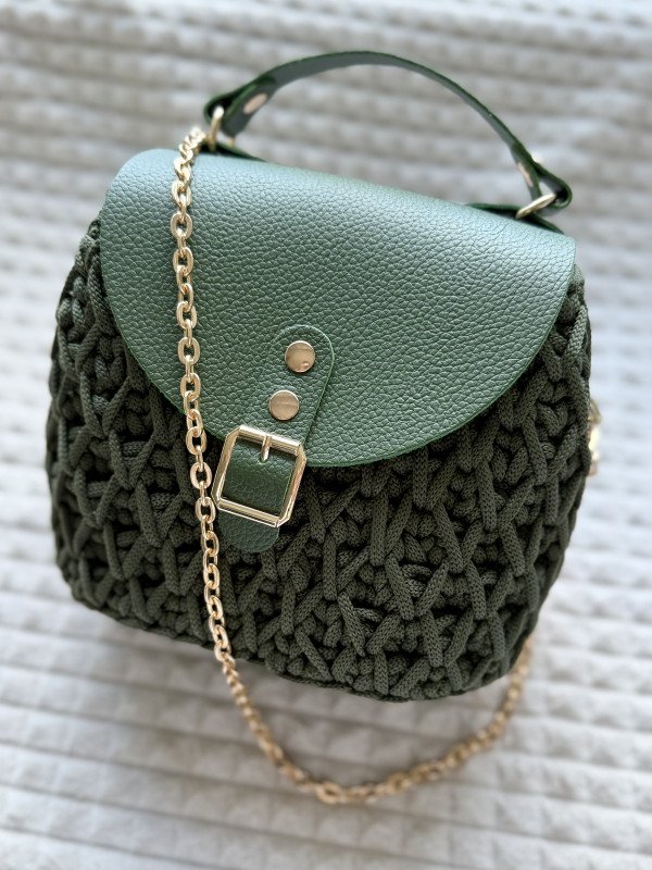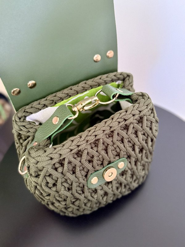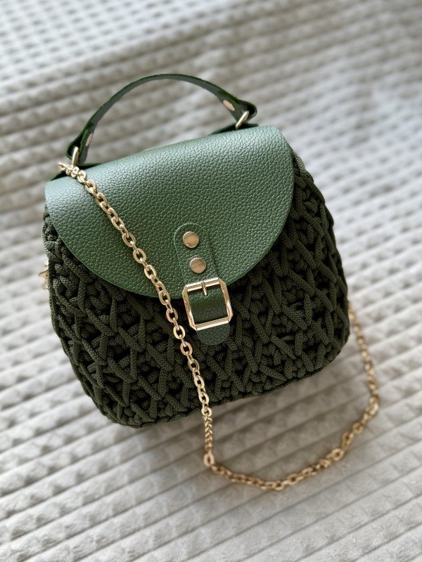 Stylowa, ręcznie robiona torebka KUFEREK w modnym ciemno zielonym kolorze. Wykonana techniką szydełkową z wysokiej jakości sznurka i uzupełniona eleganckimi dodatkami ze skóry naturalnej: klapą, spodem i paskami. Torebka posiada podszewkę.