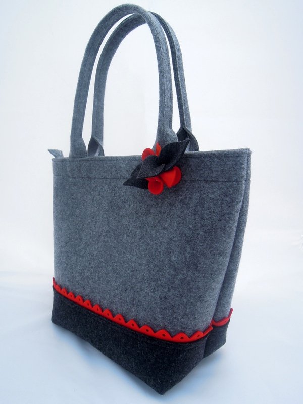 Torebka została wykonana z grubego, mocnego filcu. Torebka jest zdobiona falbanką, inspirowaną folkiem oraz filcową broszką (broszka jest w cenie torebki). Szerokość torebki - w najszerszym miejscu około 41 cm (góra), 32cm (na dole), wysokość około 31 cm, głębokość na dole około 16 cm. Torebka została wykonana z dbałością o każdy szczegół - zapięcie na suwak, w środku 2 kieszonki- na telefon i inne drobiazgi. Z tyłu torebki znajduje się bardzo duża kieszonka na suwak. Wewnątrz torebki znajduje się ładna podszewka. Torebka jest bardzo pojemna - mieści format A4. Rączki torebki zostały dodatkowo wzmocnione taśmą - są bardzo mocne. Długość rączek - około 54cm.