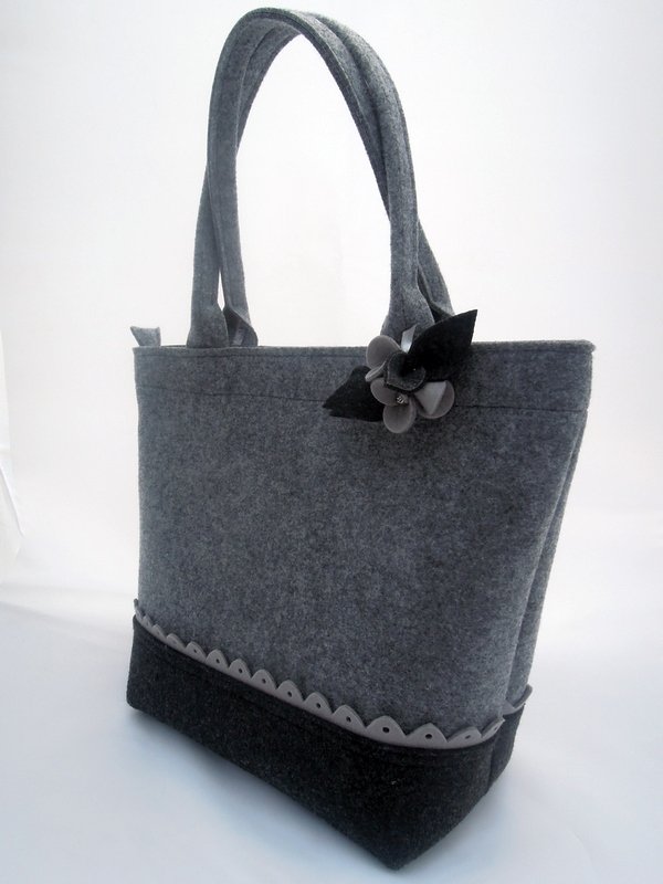 Torebka została wykonana z grubego, mocnego filcu. Torebka jest zdobiona falbanką, inspirowaną folkiem oraz filcową broszką (broszka jest w cenie torebki). Szerokość torebki - w najszerszym miejscu około 41 cm (góra), 32cm (na dole), wysokość około 31 cm, głębokość na dole około 16 cm. Torebka została wykonana z dbałością o każdy szczegół - zapięcie na suwak, w środku 2 kieszonki- na telefon i inne drobiazgi. Z tyłu torebki znajduje się bardzo duża kieszonka na suwak. Wewnątrz torebki znajduje się ładna podszewka. Torebka jest bardzo pojemna - mieści format A4. Rączki torebki zostały dodatkowo wzmocnione taśmą - są bardzo mocne. Długość rączek - około 54cm.