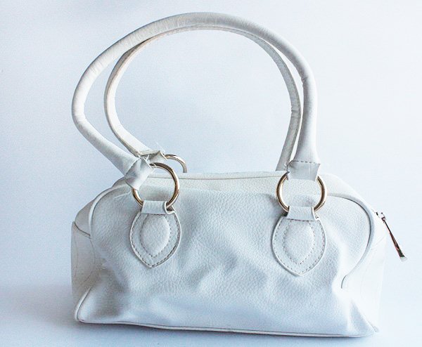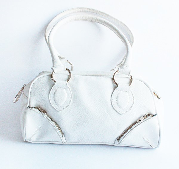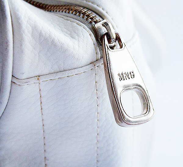 Biała torebka ze skóry ekologicznej od MNG. Wewnątrz podszewka i kieszonka na suwak. Posiada małe przebarwienie z tylu zaznaczone na zdjęciu oraz ślady na uchwytach widoczne na zdjęciu.