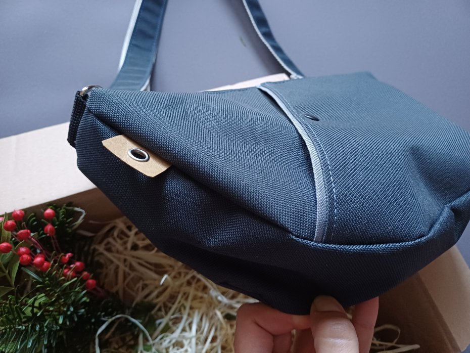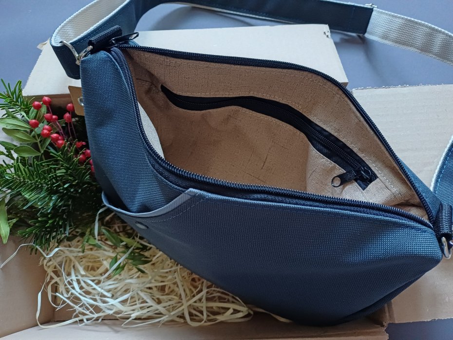 W środku kieszen zamykana na suwak. Bardzo pojemna. Kolor antracytowy.