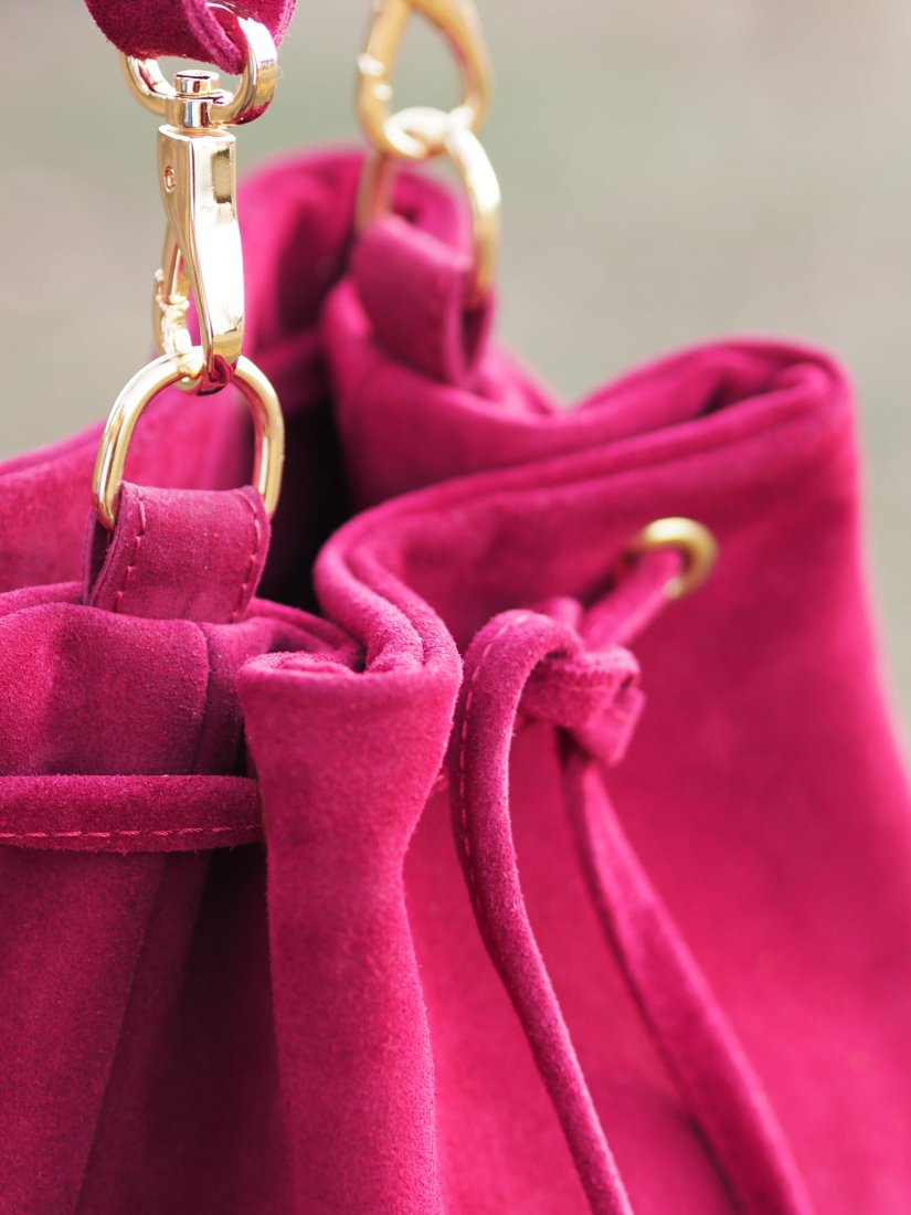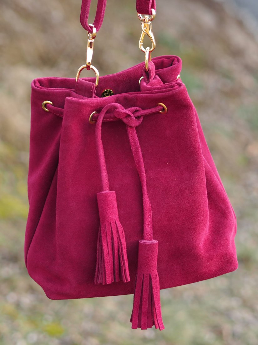 Uniwersalna i klasyczna torebka – mini worek wykonana w całości z wysokiej jakości skóry zamszowej pozyskanej z polskiej garbarni.