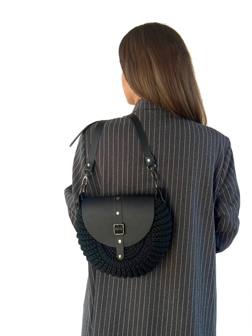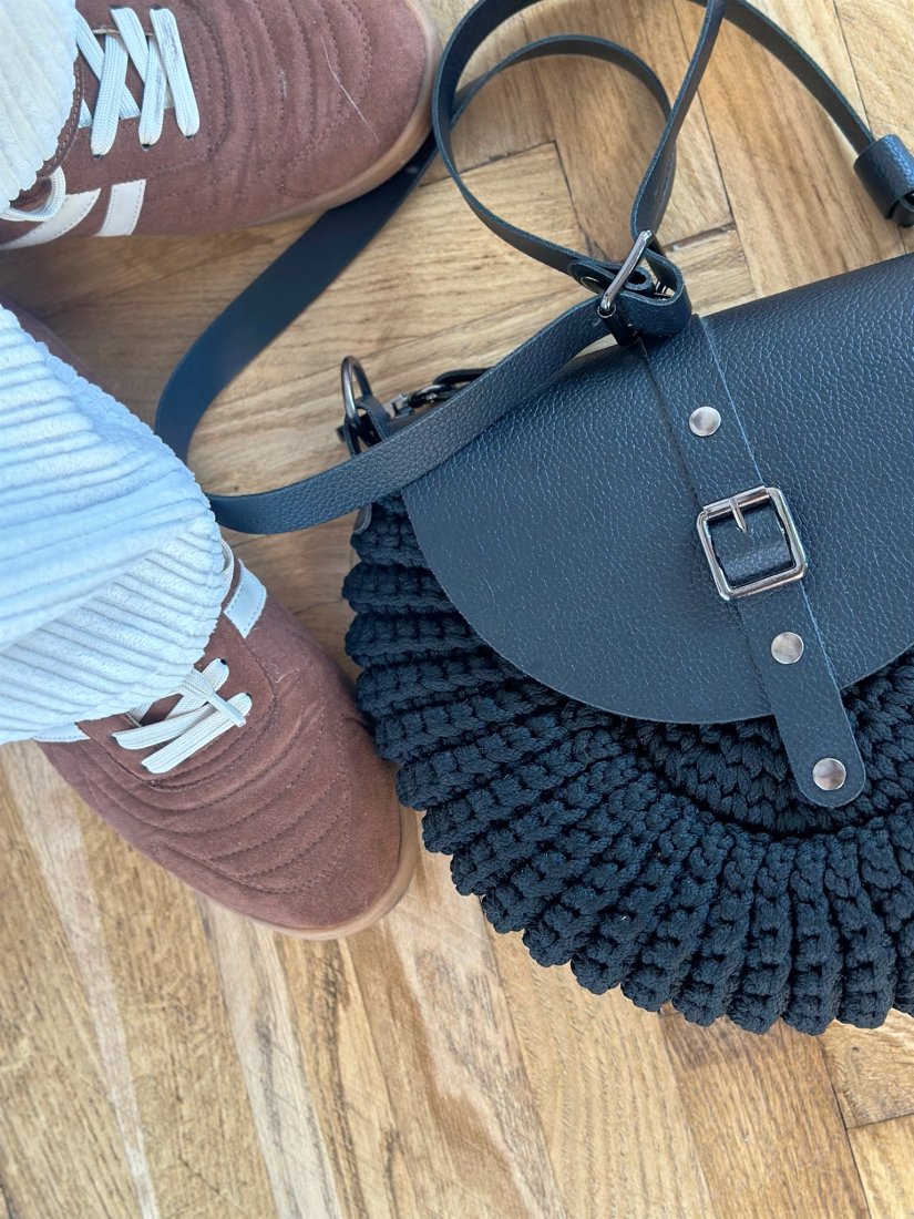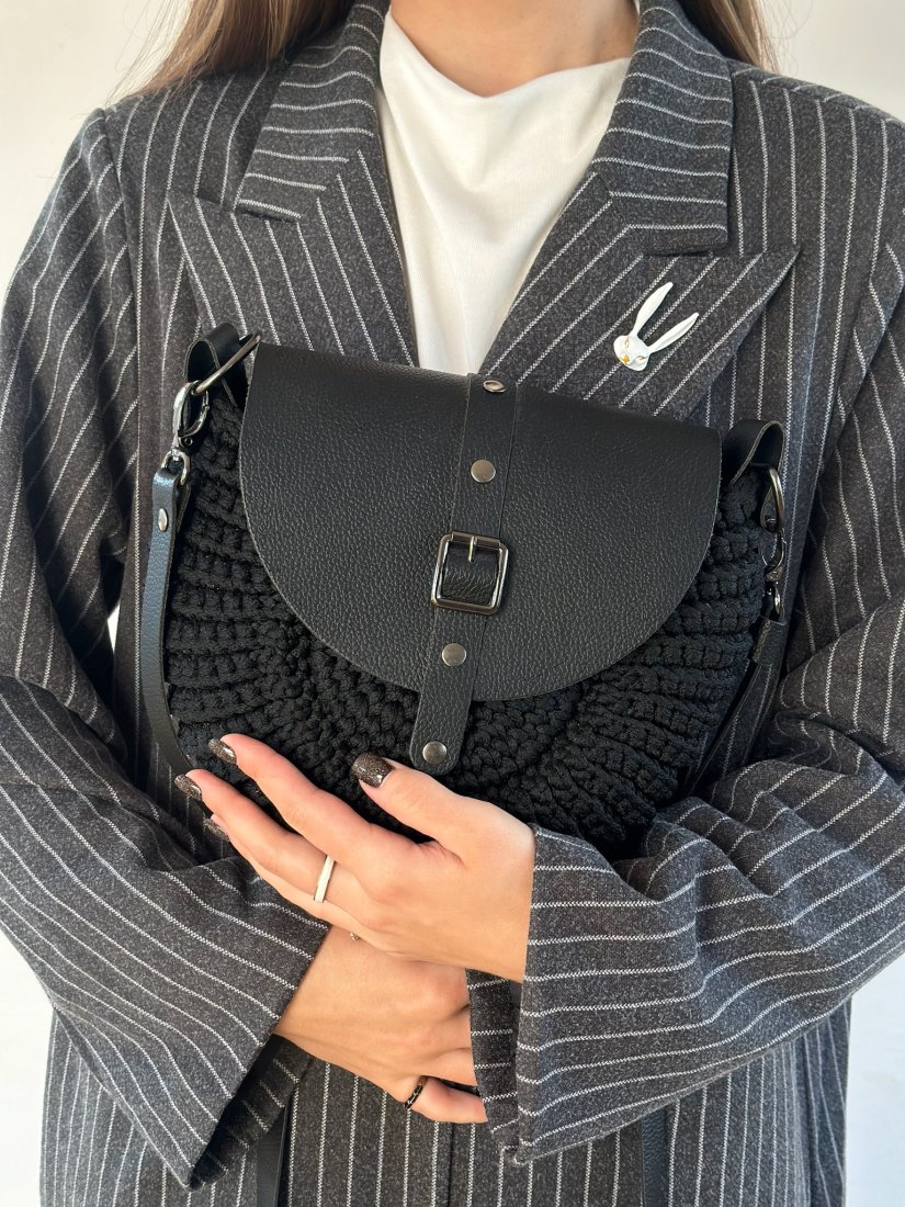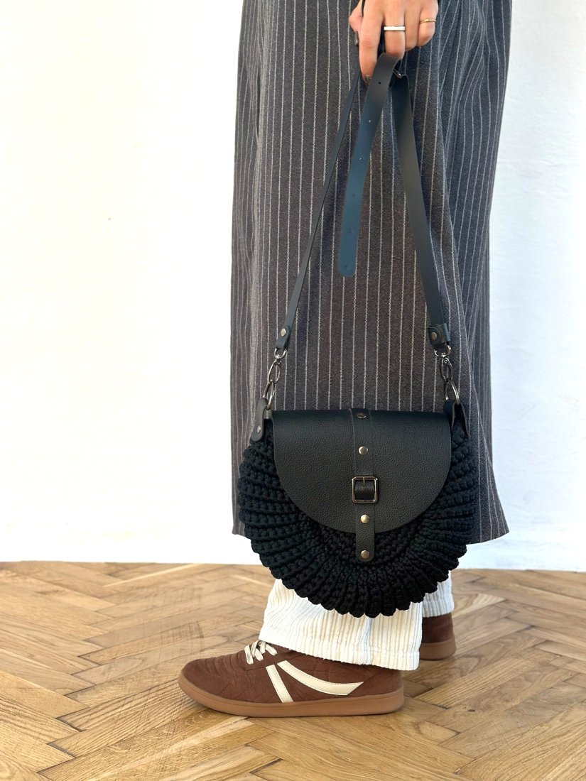 Model w kolorze czarnym z elegancką klapką i paskiem ze skóry naturalnej. Połączenie rękodzieła z minimalistycznym, nowoczesnym stylem sprawia, że torebka pasuje zarówno do codziennych, jak i bardziej eleganckich stylizacji.
