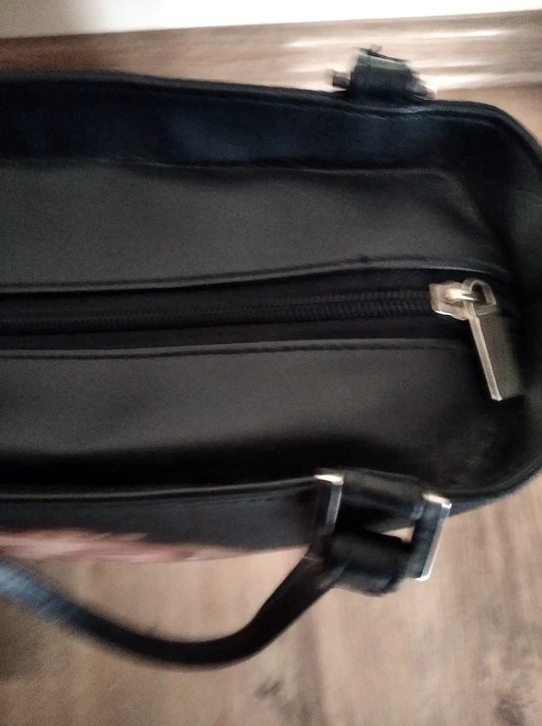 Torebka zamykana na zamek, jednokomorowa, podszewka wewnątrz czarna, wewnątrz mała kieszonka zapinana na suwak oraz jedna mała otwarta kieszonka.