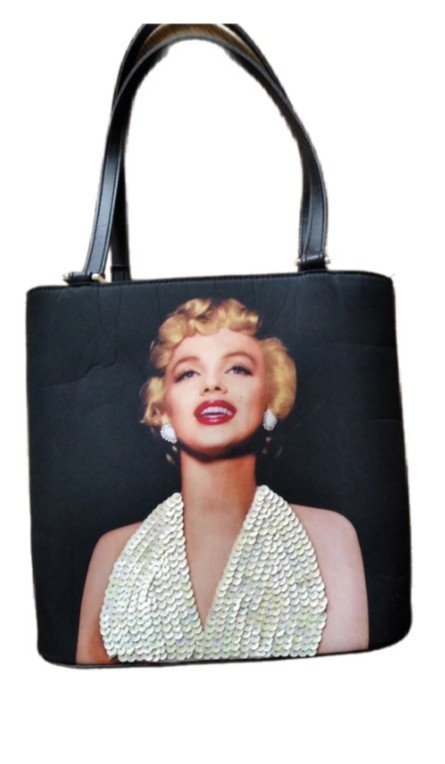 Z dwóch stron zdjęcie aktorki- z jednej strony ozdobiona błyszczącymi oczkami oraz cekinami. Torebka na dwóch rączkach /długość - 60 cm/. Wykonana z impregnowanego materiału, pasek oraz spód - z czarnej skórki ekologicznej.