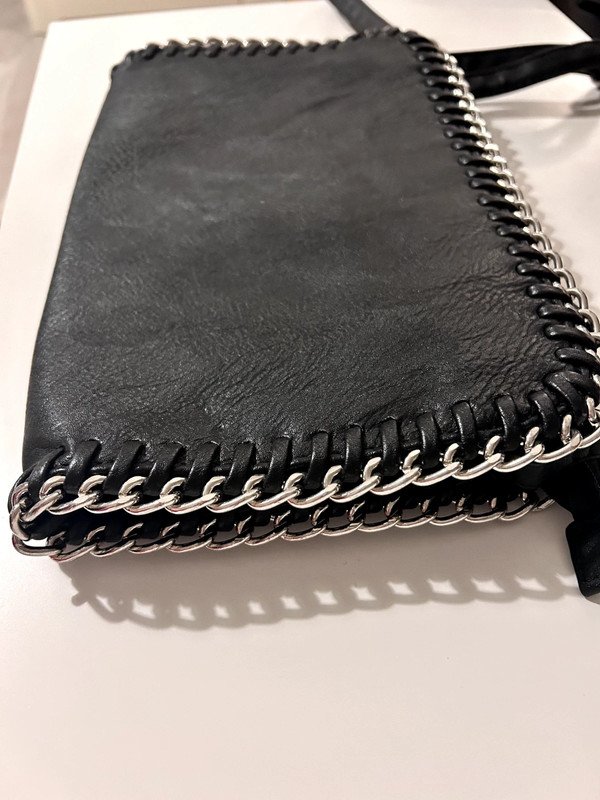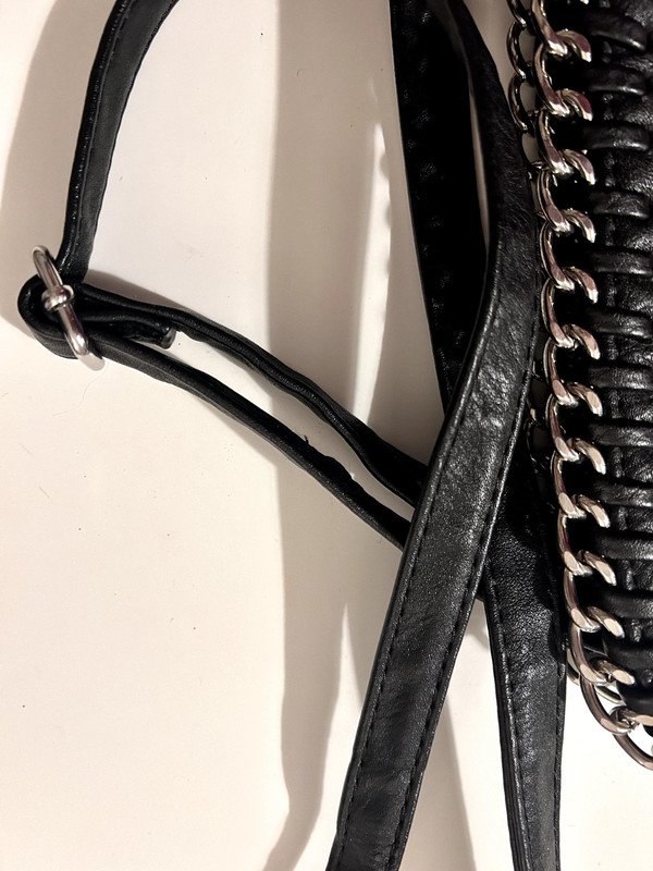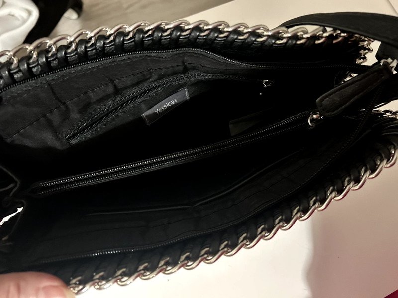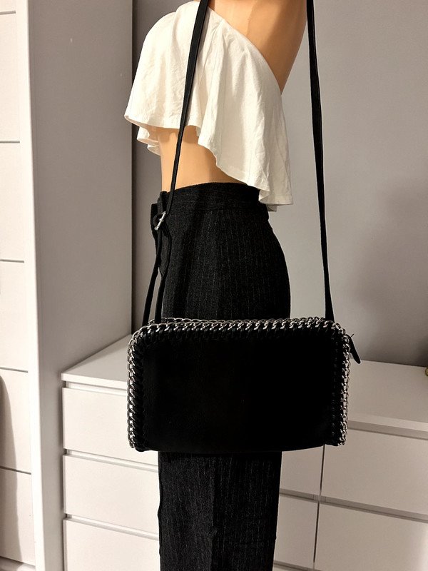 Torebka retro, vintage z lat 90 firmy C&A Yessica. W kolorze czarnym, zdobiona po obwodzie łańcuszkiem, posiada długi, regulowany pasek. W bardzo dobrym stanie wewnątrz I na zewnątrz. Polecam
