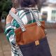 Mała brązowo-granatowa skórzana teczka na ramię.