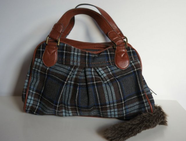 Śliczna torebka do ręki i na ramię /pasek odpinany/. Wykonana z tkaniny w kratkę z skórzanymi wykończeniami.Zapinana na zamek. W środku jest kieszonka zapinana na zamek, kieszonka na telefon i dokumenty. Stan b.dobry.
