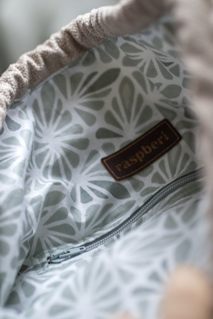Ściągana jest jak worek bawełnianym sznurkiem w kolorze zielonym. Dół daje dodatkowe miejsce na przechowywanie rzeczy - z przodu dwie mniejsze, z tyłu torby jedna duża kieszeń.