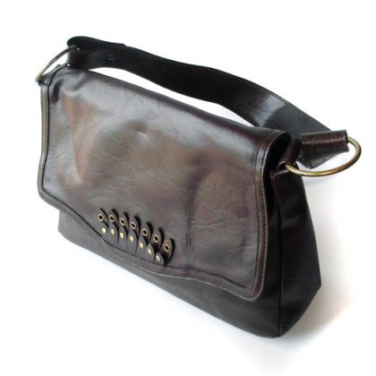 Torebka średniego formatu z ekologicznej skóry w kolorze ciemnobrązowym, na ramię. W środku czekoladowa podszewka oraz dwie kieszonki ( w tym jedna na suwak). Zamykana na magnes. Szer. 35 cm , wys. 22 cm, dno szer. 10 cm, dł. uchwytu 50 cm. Stan bardzo dobry, bez uszkodzeń. Marka George.