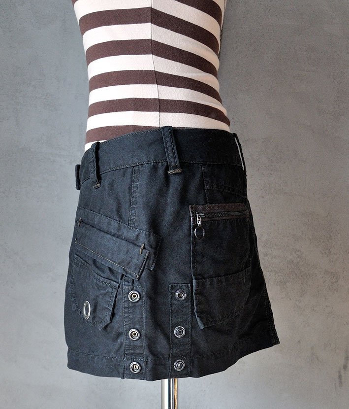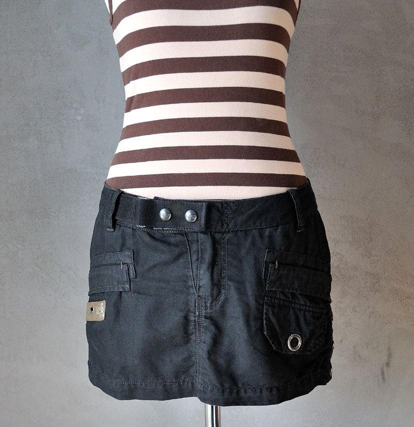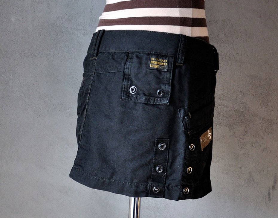 Niesamowita, ultrakrótka mini spódnica marki G-Star RAW, model Fleet Skirt mini. Czarna, z ciemnobrązowymi przeszyciami. Zapinana na zamek i pasek z zatrzaskami. Jak to u tej marki: dużo przeszyć, zatrzasków, naszywki, ciekawie zrobione kieszenie.