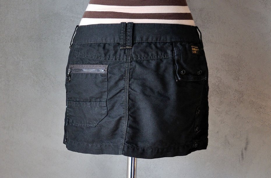 Niesamowita, ultrakrótka mini spódnica marki G-Star RAW, model Fleet Skirt mini. Czarna, z ciemnobrązowymi przeszyciami. Zapinana na zamek i pasek z zatrzaskami. Jak to u tej marki: dużo przeszyć, zatrzasków, naszywki, ciekawie zrobione kieszenie.