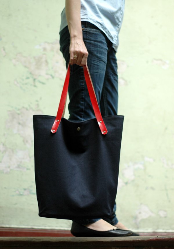 Duża pojemna torba na ramię i do ręki. Wykonana z ciemno granatowego dżinsu z uchwytami z grubej naturalnej skóry w kolorze intensywnej czerwieni. Dno usztywnione. Zamykana na magnes. W środku podszewka z kieszenią 19 x 19 cm. Dodatki metalowe w kolorze starego złota. Wymiary: szerokość torby u góry na płasko 44 cm, szerokość dna u dołu 27 cm, wys. ok 40 cm ,uchwyty dł. 54 cm.