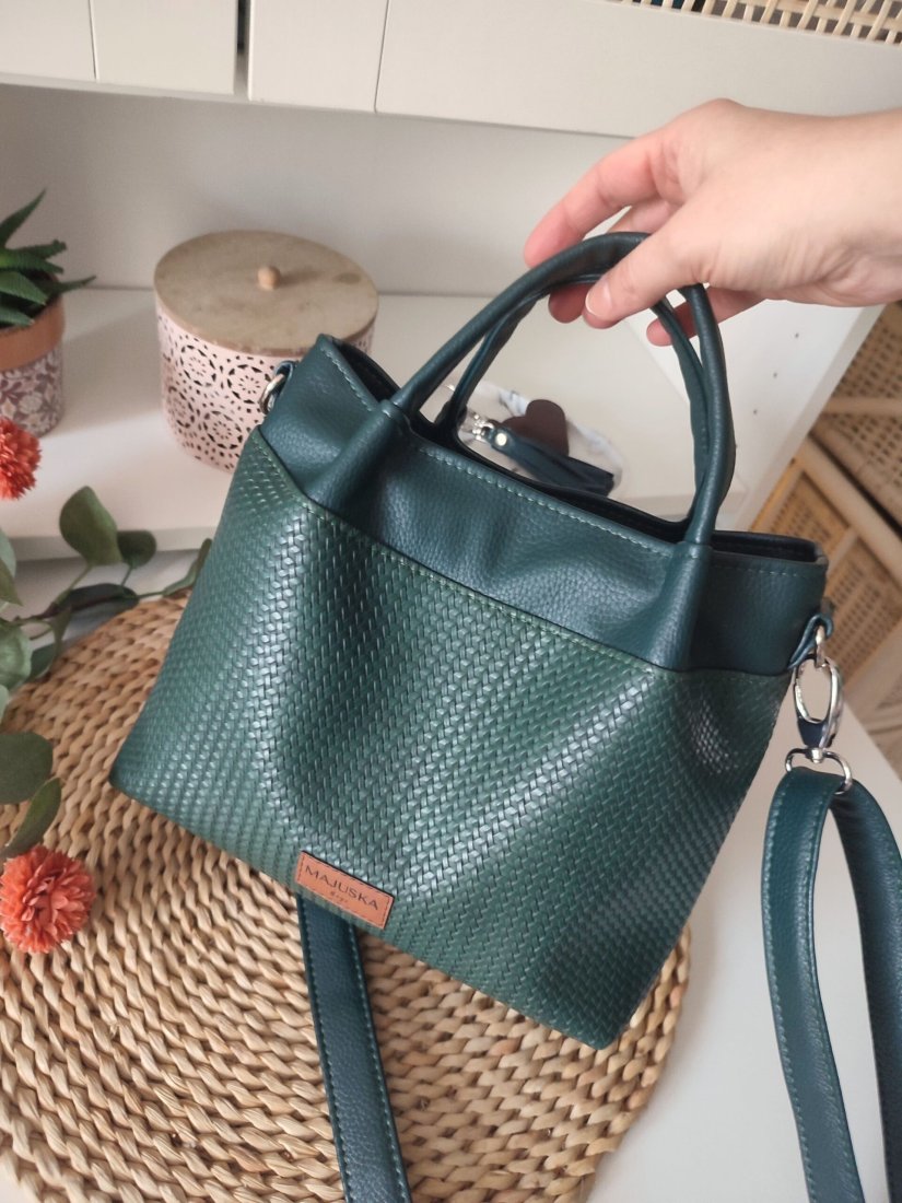 Idealny rozmiar na co dzień. Mała i zgrabna, a przy tym niezwykle pojemna. Pomieści wszystko co niezbędne w codziennym użytkowaniu. Uszyta z zielonej tłoczonej ekoskóry. Podszewka z tkaniny wodoodpornej z wzorem.