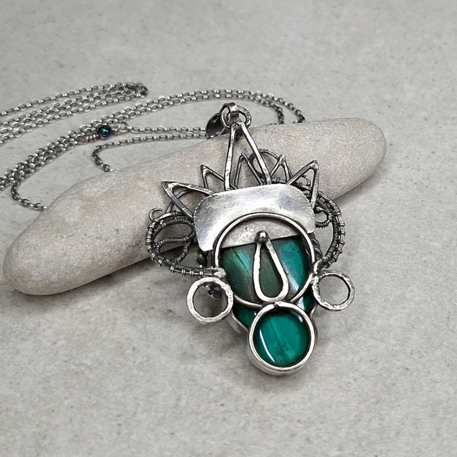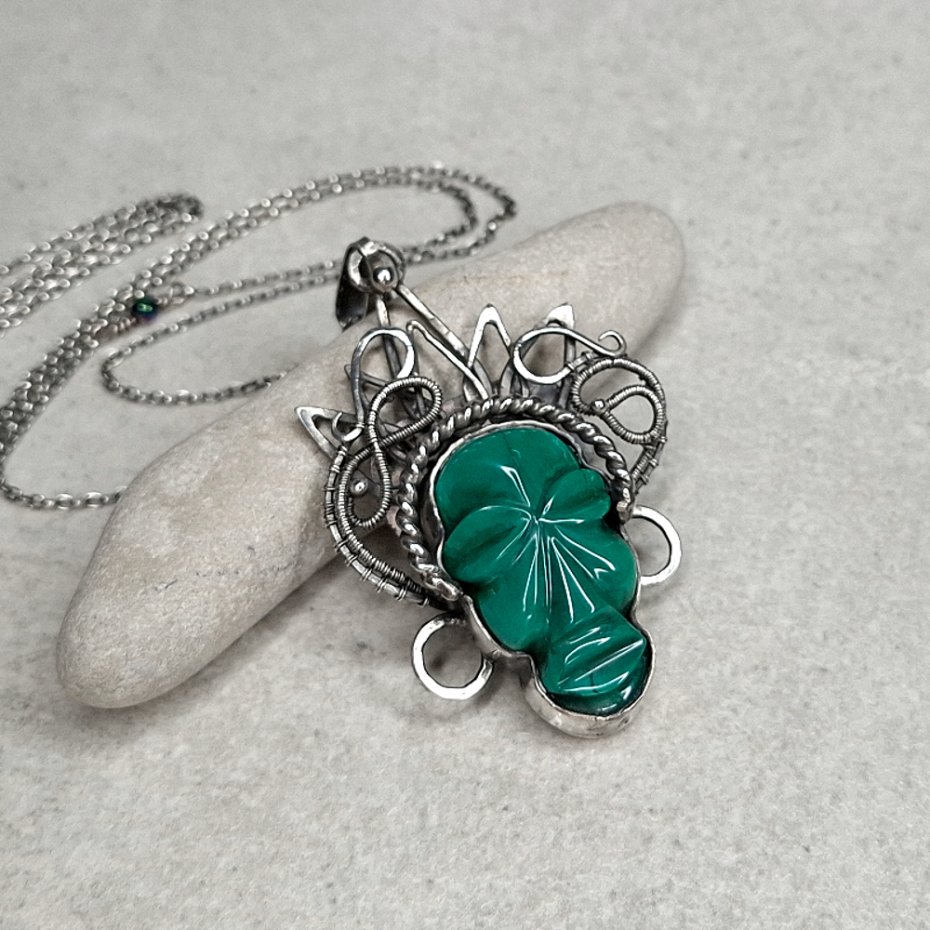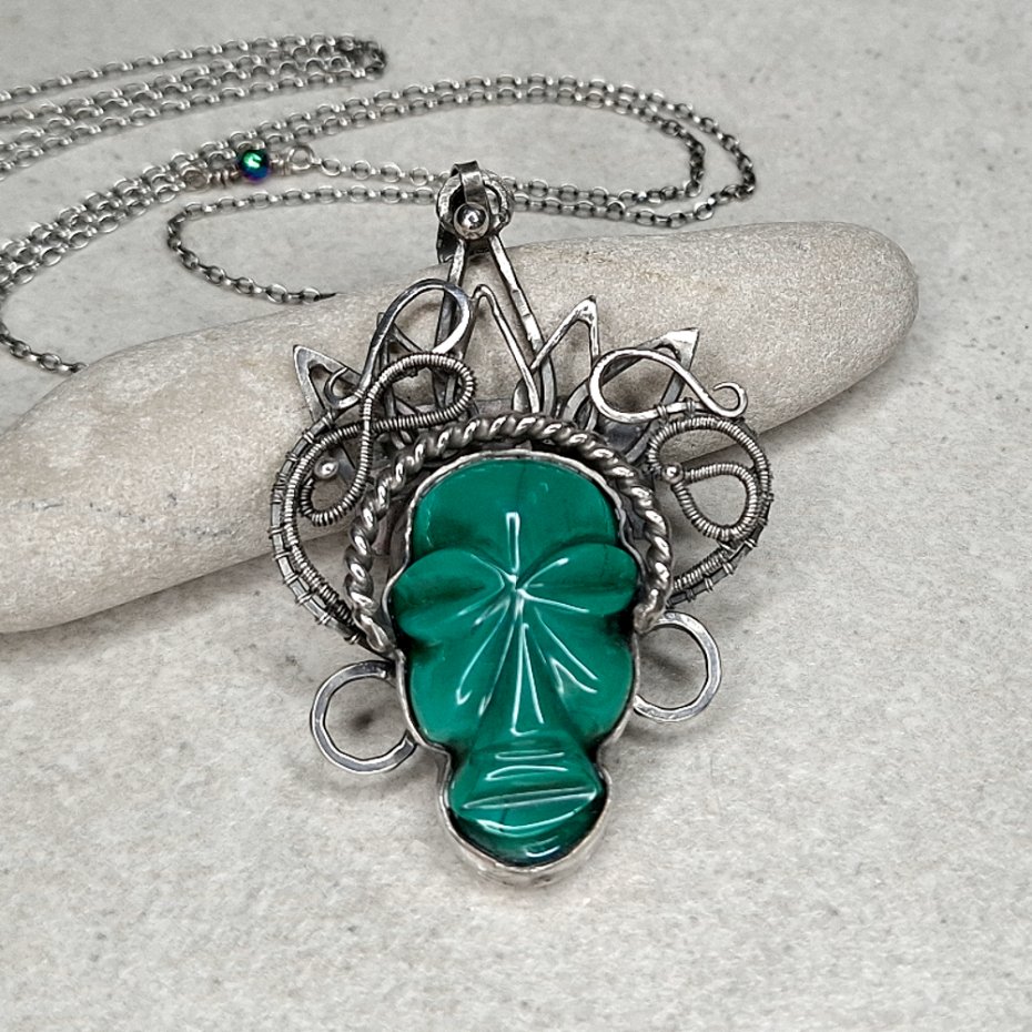 Srebrny naszyjnik z maską rzeźbioną w malachicie, wykonany w całości ręcznie. Wisior naszyjnika został wykonany ze srebra próby 925, 930 i 999. Centralny element w postaci kamiennej maski w kolorze zielonym oplatają srebrne ręcznie kształtowane pasma tworzące plemienny pióropusz, naszyjnik został wykonany w taki sposób aby obie strony biżuterii były ozdobne. Wisior zawiesiłam na srebrnym łańcuszku typu rollo ozdobionym kuleczkami tęczowego hematytu. Wymiary zawieszki w najszerszym miejscu: ok. 39x55 mm, długość zawieszki z krawatką 67mm, długość naszyjnika z zapięciem ok 66cm. Naszyjnik został mocno zoksydowany i wypolerowany. Biżuteria zostanie ozdobnie zapakowana.