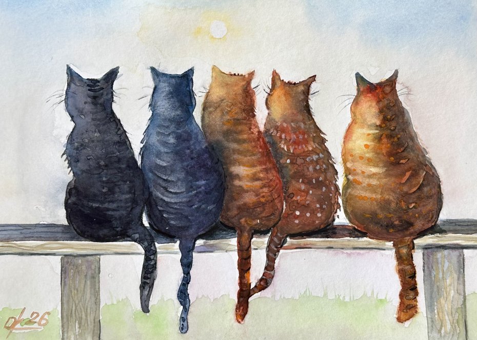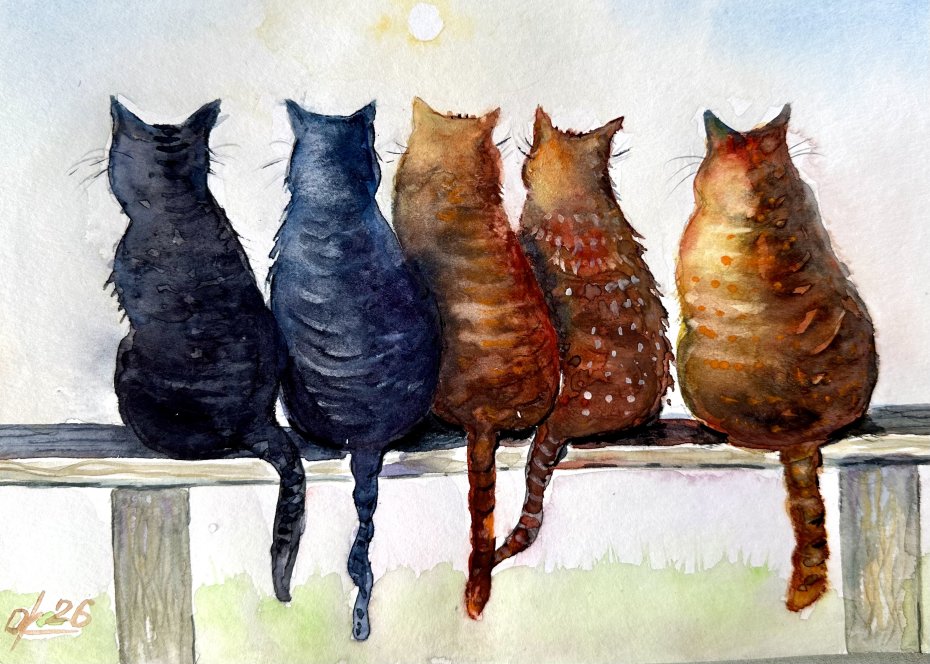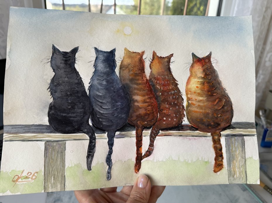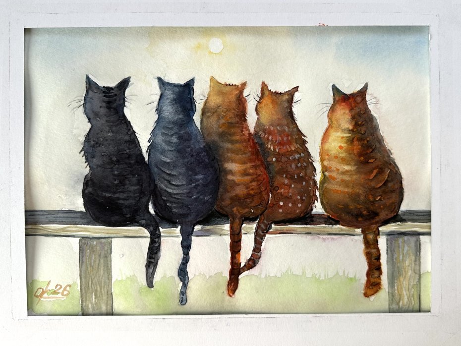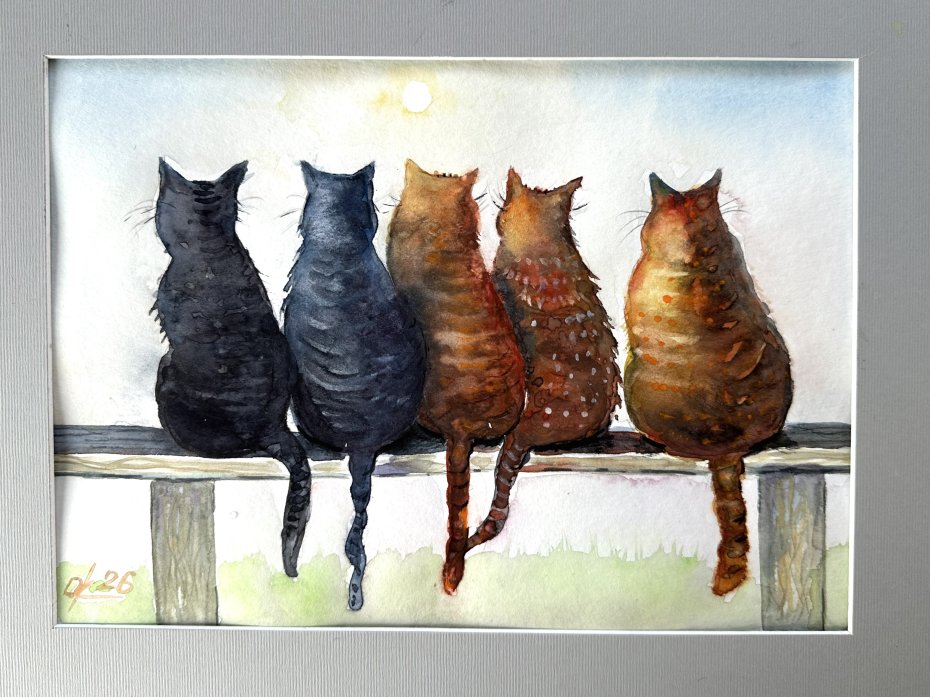 Towarzystwo kotów Original Akwarela A4 ręcznie malowana.