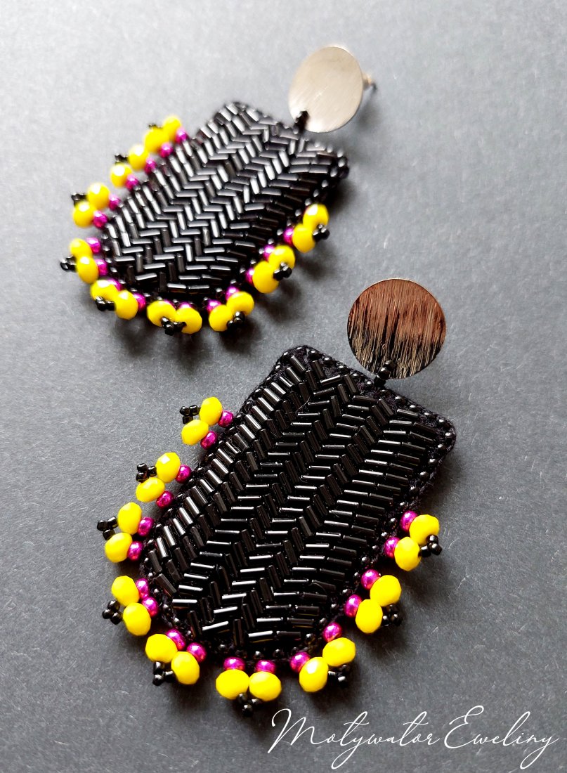 Efektowne kolczyki na ozdobnych sztyftach, wykonane pracochłonną techniką haftu drobnymi, szklanymi koralikami. Jednostronne, spodnia strona podszyta delikatną, naturalną skórą w czarnym kolorze. Sztyfty posrebrzane, nieuczulające z posrebrzanymi barankami z zabezpieczeniem silikonowym wewnątrz. Wymiary: długość wraz z zapięciem: 6,5 cm, szerokość max. 3,8 cm.