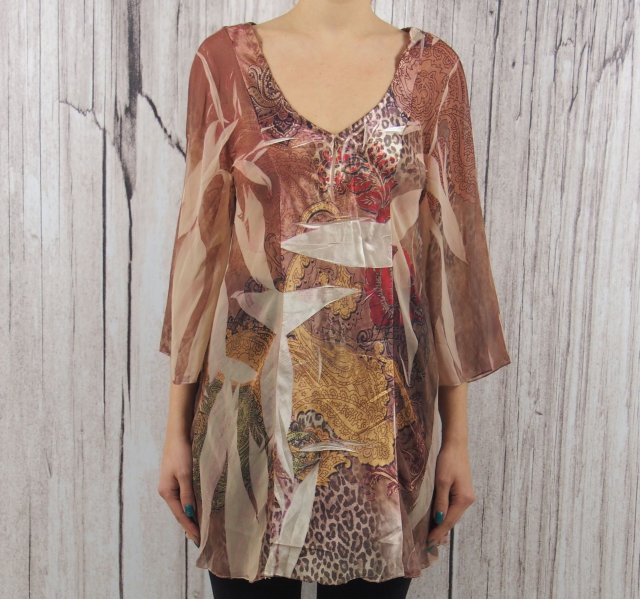 Lekko transparentna tunika etno. Środkowa część z jakby satyny, boki moim zdaniem z żorżety.
