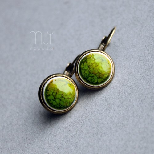 Okrągłe ceramiczne kolczyki, ręcznie wykonane z delikatnej jasnobeżowej gliny kamionkowej, szkliwione mieszanką zielonych szkliw z efektem plamek, na zamkniętych biglach w kolorze starego złota. Średnica elementu ceramicznego ok. 12mm, długość bigla ok 19mm. Istnieje możliwość wykonania pasującego pierścionka lub kolczyków w formie sztyftów Polecam
