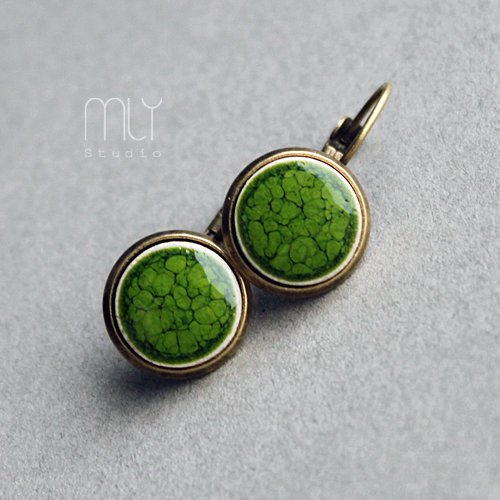 Okrągłe ceramiczne kolczyki, ręcznie wykonane z delikatnej jasnobeżowej gliny kamionkowej, szkliwione mieszanką zielonych szkliw z efektem plamek, na zamkniętych biglach w kolorze starego złota. Średnica elementu ceramicznego ok. 12mm, długość bigla ok 19mm. Istnieje możliwość wykonania pasującego pierścionka lub kolczyków w formie sztyftów Polecam
