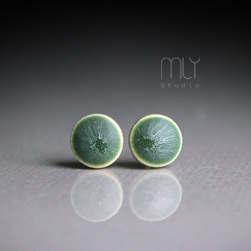 Oryginalne ceramiczne kolczyki w formie sztyftów, ręcznie wykonane z delikatnej gliny kamionkowej, jednostronnie szkliwione matowym zielonym szkliwem z efektem drobnych plamek, na antyalergicznych sztyftach w kolorze srebrnym. Średnica ok 6mm. Polecam