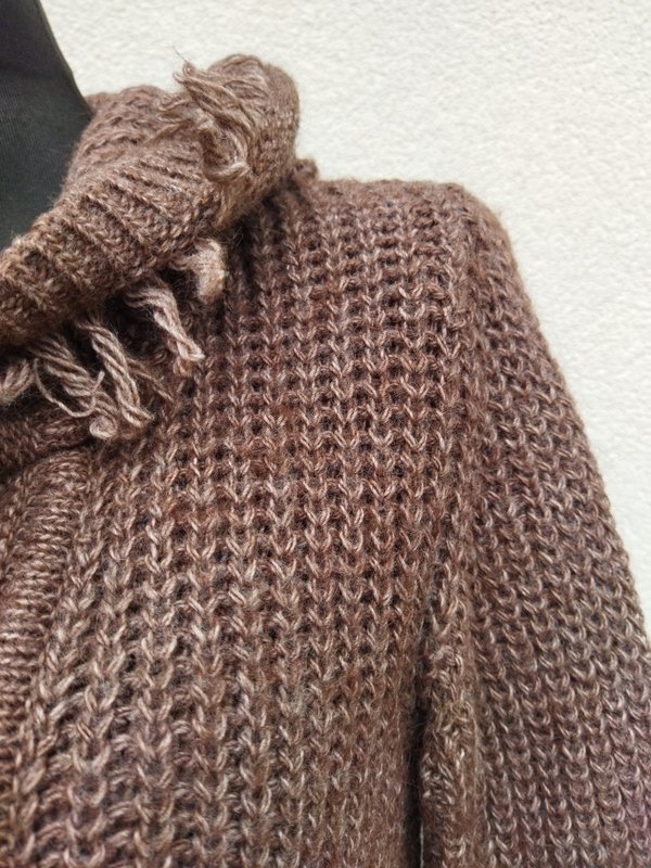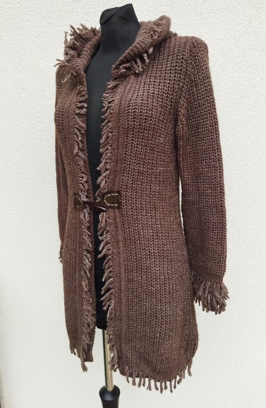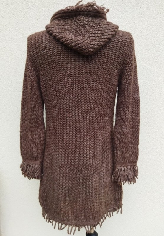 Dłuższy sweter wykonany puszystym ściegiem angielskim z akrylowej włóczki w melanżowym brunatnym kolorze. Z kapturem. Zdobiony frędzlami z tej samej włóczki. Zapinany w pasie na jeden guzik - kołek.
