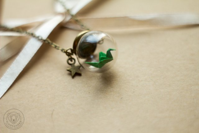 Delikatny, maleńki, papierowy żuraw - japoński symbol szczęścia, zdrowia i pokoju. Podobno, jeśli w jakiejś intencji złoży się tysiąc żurawich figurek, to życzenie się spełni. My spełniamy życzenia tym zjawiskowym wisiorkiem. Papierowy żuraw ukryty w szklanej kuleczce o najszerszej średnicy 2 cm. Część ozdobna zawieszona na łańcuszku o długości 36 cm. Całość w kolorze starego złota/brązu.