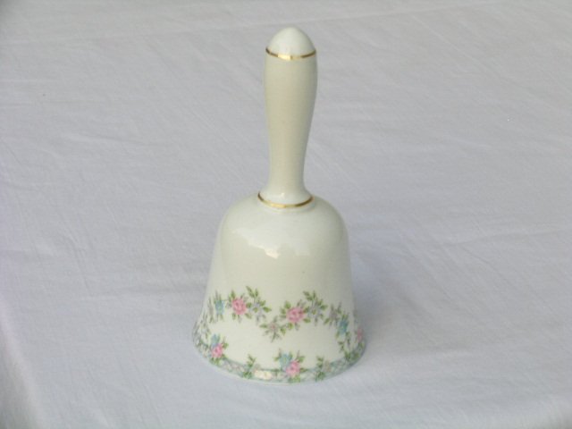 Przyjemnie dźwięczący porcelanowy dzwonek z uroczym, delikatnym kwiatowym zdobieniem. Sygnatura COALPORT t, seria Trellis Rose. Błyszczące szkliwienie i złocenie na rączce. Wygodny, poręczny. Romantycznie celebracyjny