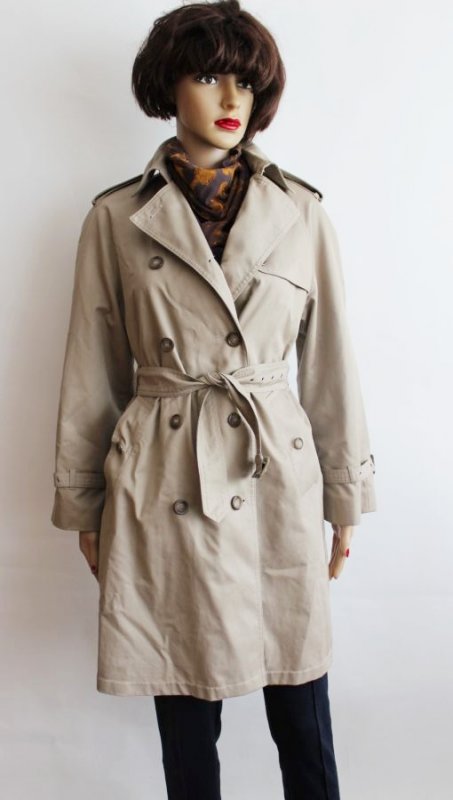 Prześliczny płaszcz wiosenny typu trencz vintage zapinany na guziki i pasek. Firmy St. Michael obecny Marks& Spencer, wyprodukowany w Anglii. Zdobienia w postaci pasków o przy rękawach i na ramionach. W pasie szeroki pasek. Płaszcz na podszewce śliczny kolor Stan bardzo dobry