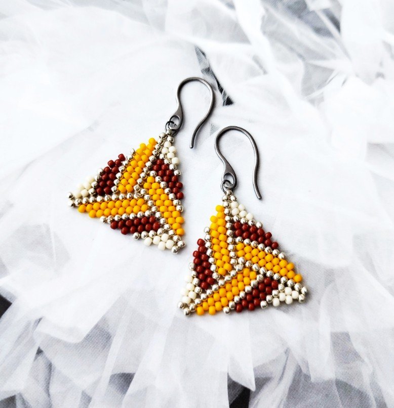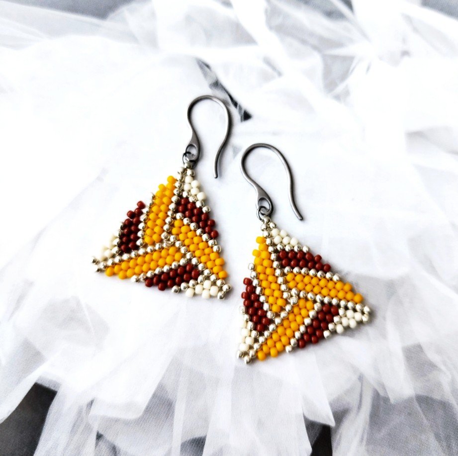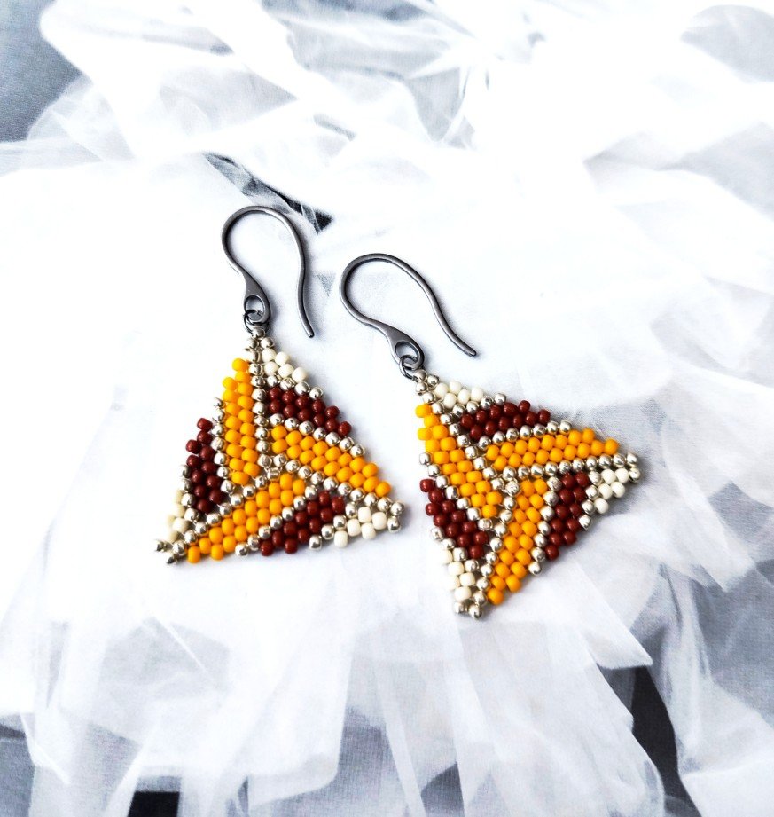 Efektowne kolczyki utkane ręcznie pracochłonną metodą beadingu ze szklanych japońskich koralików TOHO .