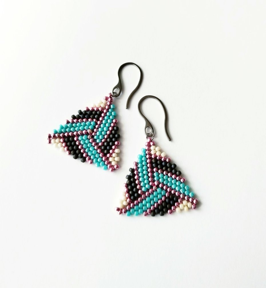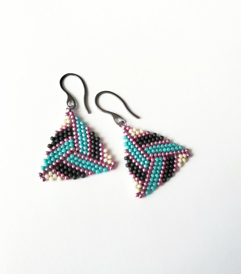 Efektowne kolczyki utkane ręcznie pracochłonną metodą beadingu ze szklanych japońskich koralików TOHO .