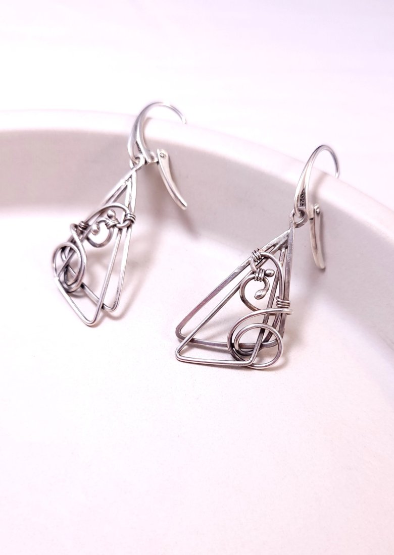 Te lekkie, geometryczne kolczyki zostały wykonane ręcznie ze srebra próby 925. Nieregularne, przestrzenne linie i finezyjne zawijasy tworzą efektowną, ale nadal minimalistyczną formę, która świetnie pasuje zarówno do codziennych stylizacji, jak i bardziej eleganckich zestawów.