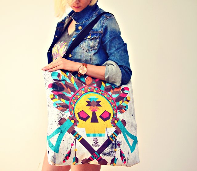 TRIBE WARRIOR tote bag by DONT NEED NO SAMURAI, cutting edge stuff. Piękna, wytrzymała a zarazem bardzo lekka torba z popeliny. Dwustronny nadruk, mocny bawełniany pasek, podwójne szwy. Prosta forma, żadnych kieszonek, suwaków, guzików. 45.7 cm x 45.7 cm