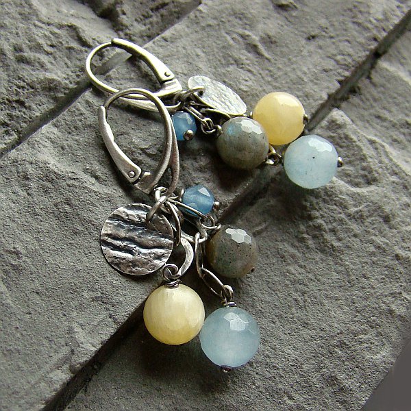 Modne, subtelne i kobiece kolczyki wykonane w całości z oksydowanego srebra próby 925 oraz kulek jadeitu, nefrytu i labradorytu wielkości 8 mm. Bigle angielskie, samozatrzaskowe. Całkowita długość kolczyków to ok. 4,8 cm. W mojej galerii bransoletka do kompletu. Ozdobnie zapakowane.