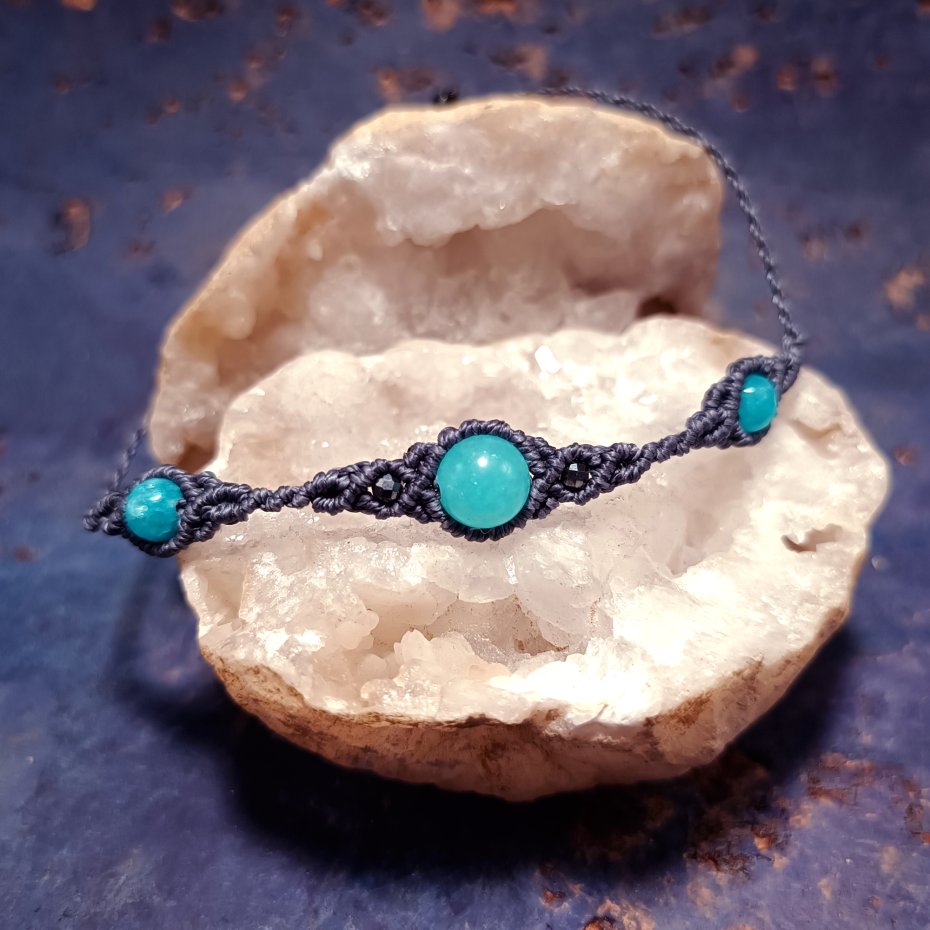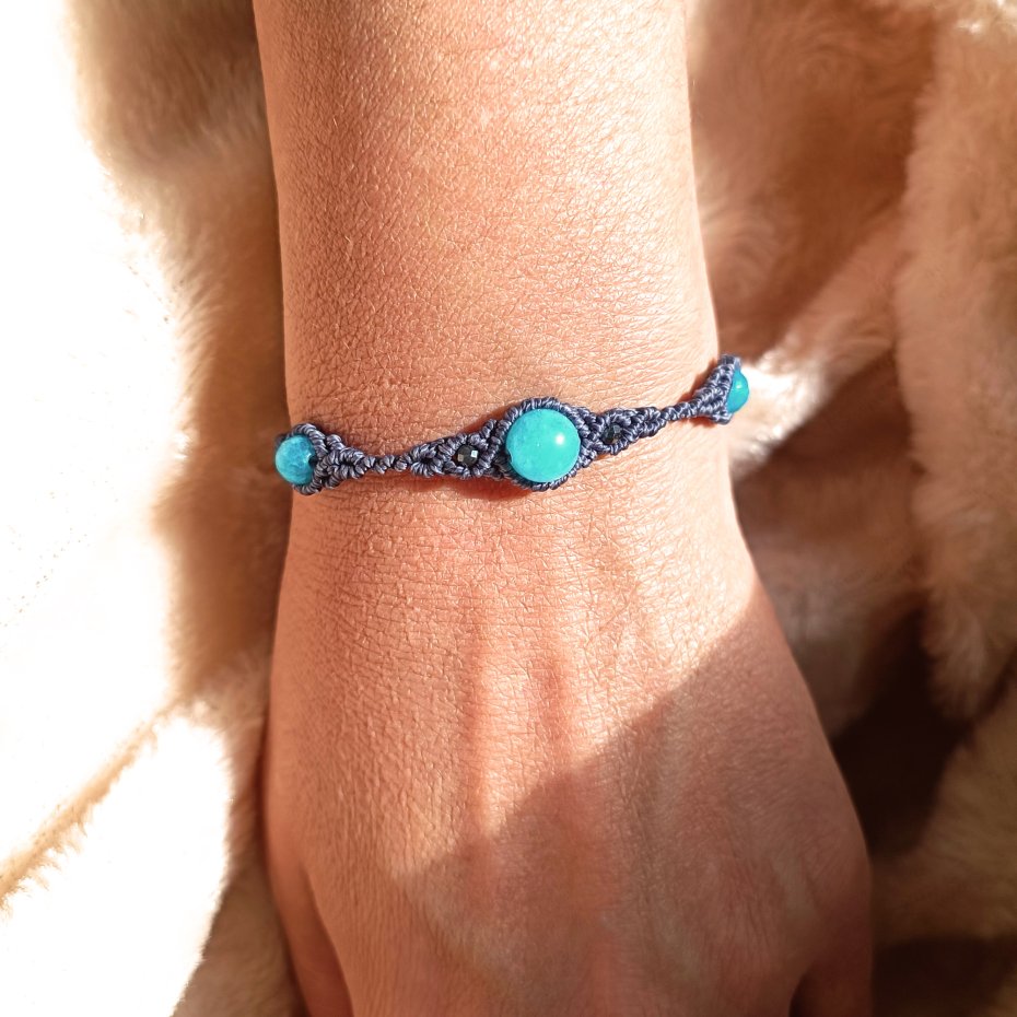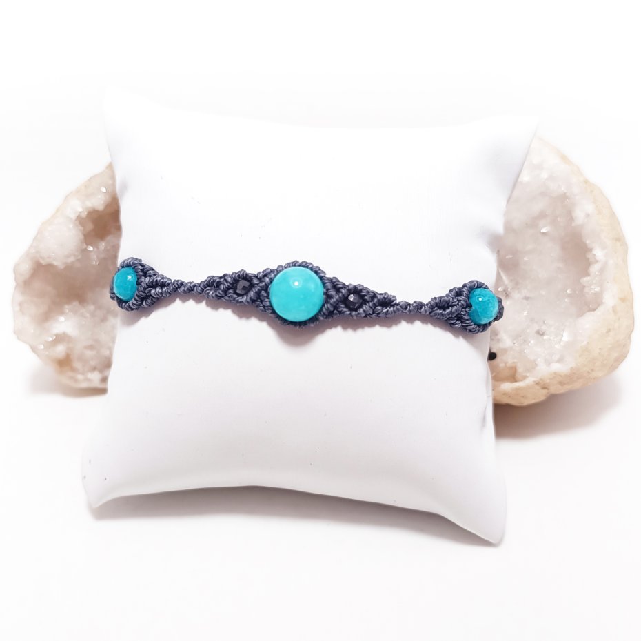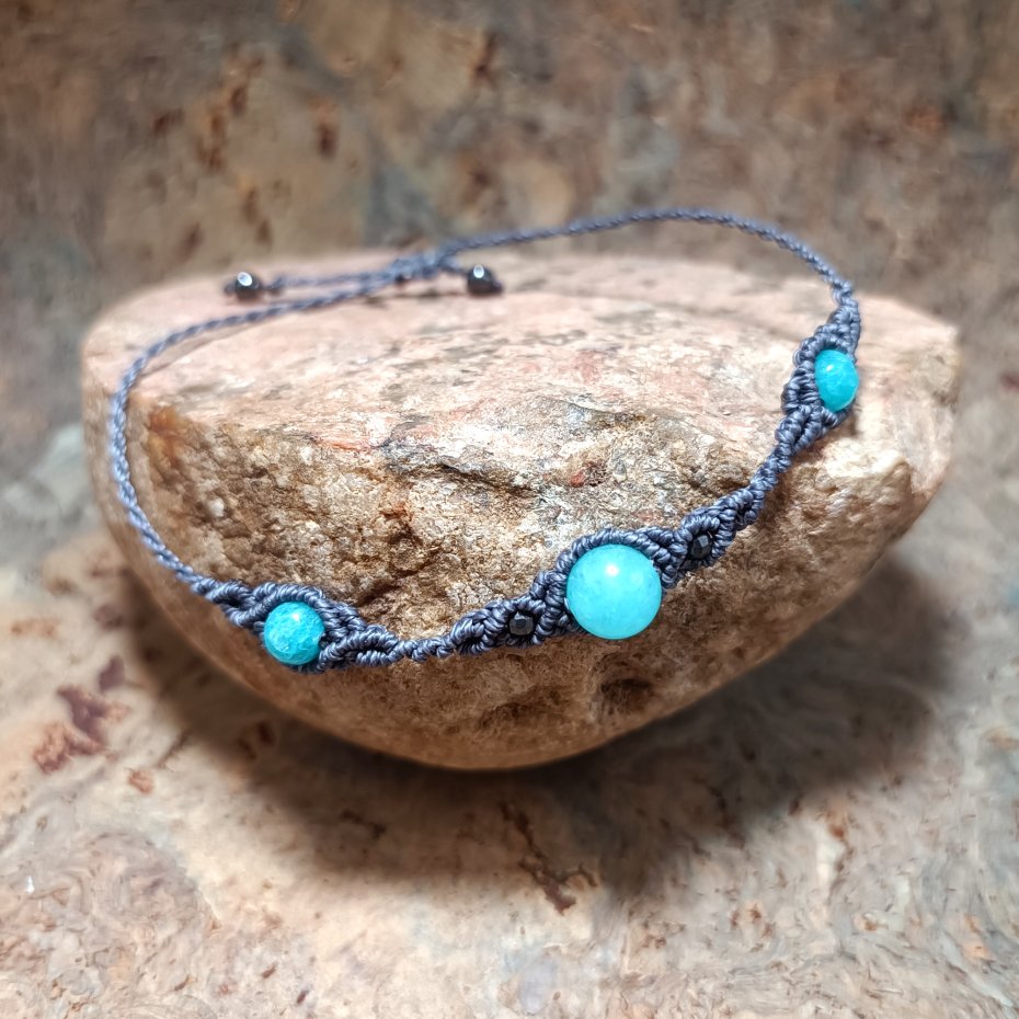 Oryginalna kompozycja kamieni naturalnych oprawionych techniką mikromakramy, wykonana ze sznurka o doskonałej jakości. Użyte kamienie to: amazonit ( 8 mm) , agat (6 mm) hematyt.