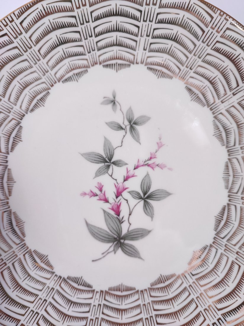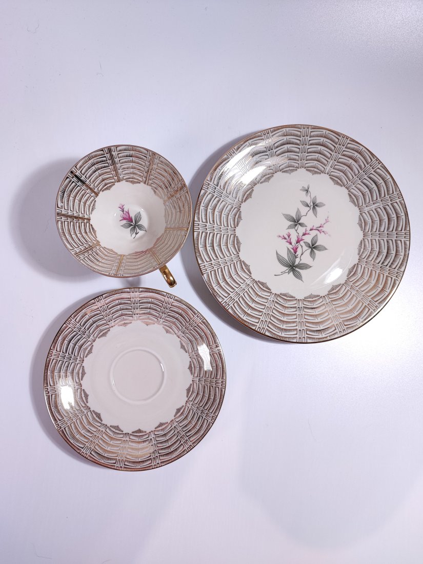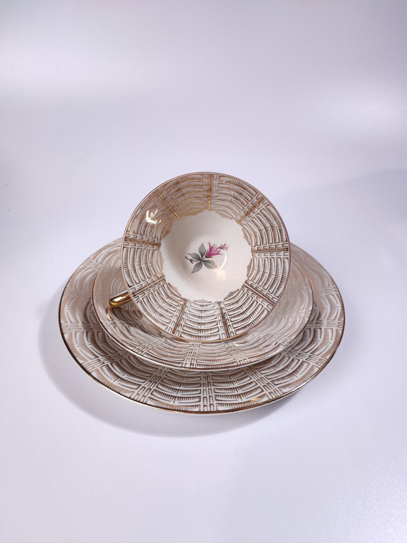 Eleganckie trio porcelanowe z Bawarii (Niemcy), datowane na lata 50.–60. XX wieku. Cienka porcelana w odcieniu ecru, zdobiona subtelną, geometryczną bordiurą w złoceniu oraz delikatnym motywem roślinnym w centrum.