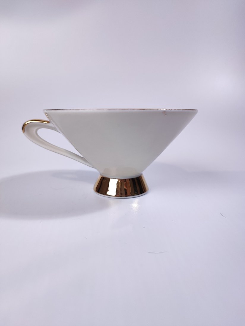 Złocona stopka i ucho filiżanki podkreślają charakter mid century. Spokojna forma, wyważona estetyka, ponadczasowy klimat vintage.