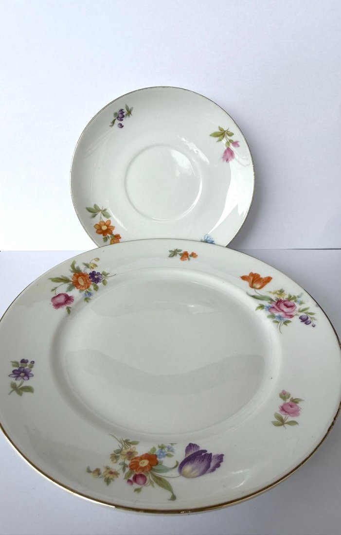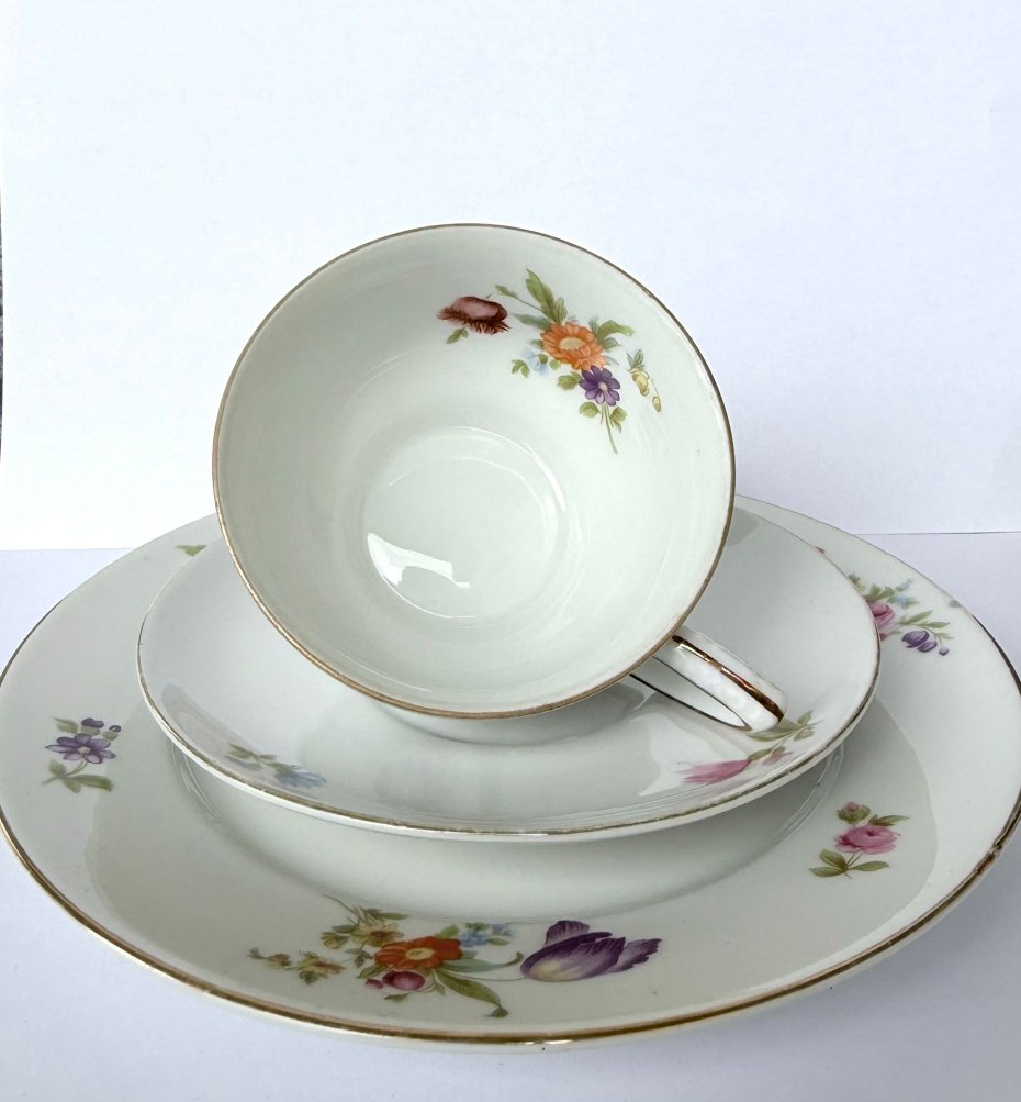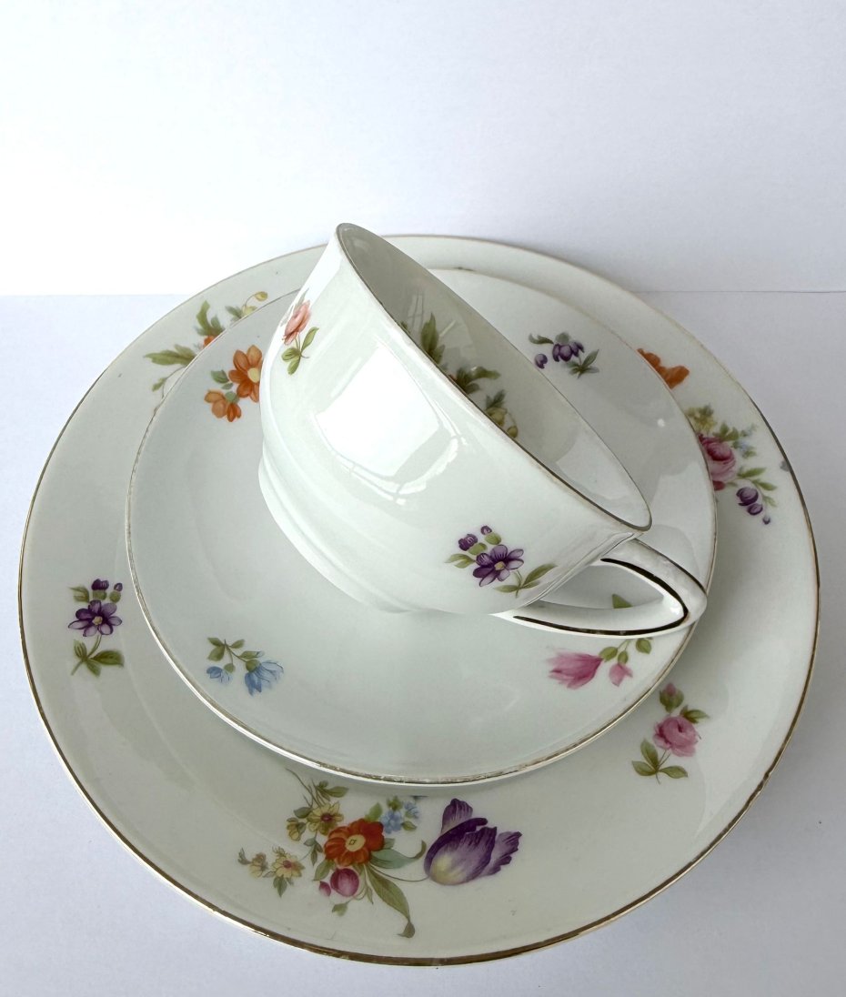 Uroczy zestaw śniadaniowy składający się z filiżanki, podstawka oraz talerza deserowego, wykonany przez cenioną bawarską wytwórnię Retsch & Co. w Wunsiedel w latach 50-60 XX wieku. Biała porcelana oraz misternie zdobienie w postaci kolorowych bukietów kwiatów polnych nadają całości subtelnego, sielskiego ale jednocześnie eleganckiego charakteru. Elegancję zestawu podkreślają delikatne złocenia na krawędziach oraz klasyczna forma uszka.