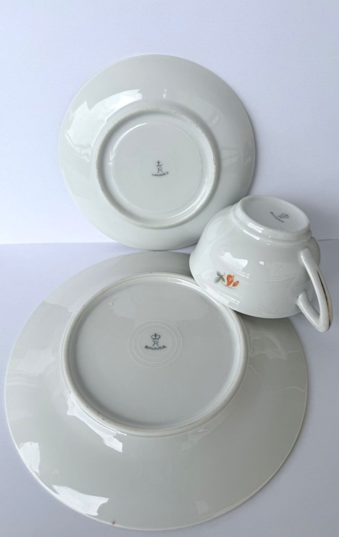 Trio zachowane jest w bardzo dobrym stanie, bez pęknięć czy wyszczerbień z niewielkimi przetarciami złocenia normalnymi dla starego wyrobu. Zestaw śniadaniowy będzie doskonałym uzupełnieniem kolekcji bawarskiej porcelany lub wyjątkowym elementem codziennego celebrowania herbaty i kawy. Sygnatura widoczna na spodzie każdego elementu potwierdza autentyczność i pochodzenie wyrobu.