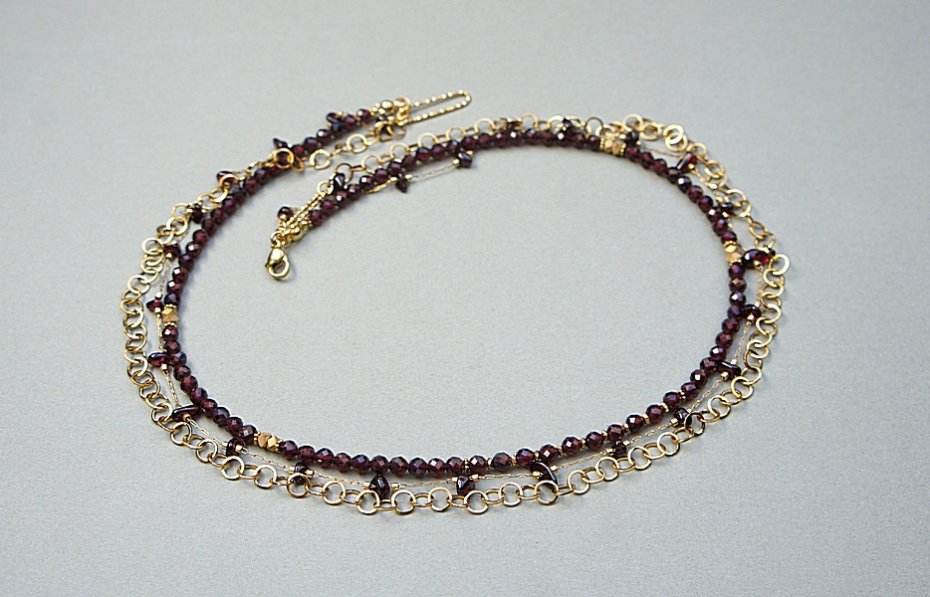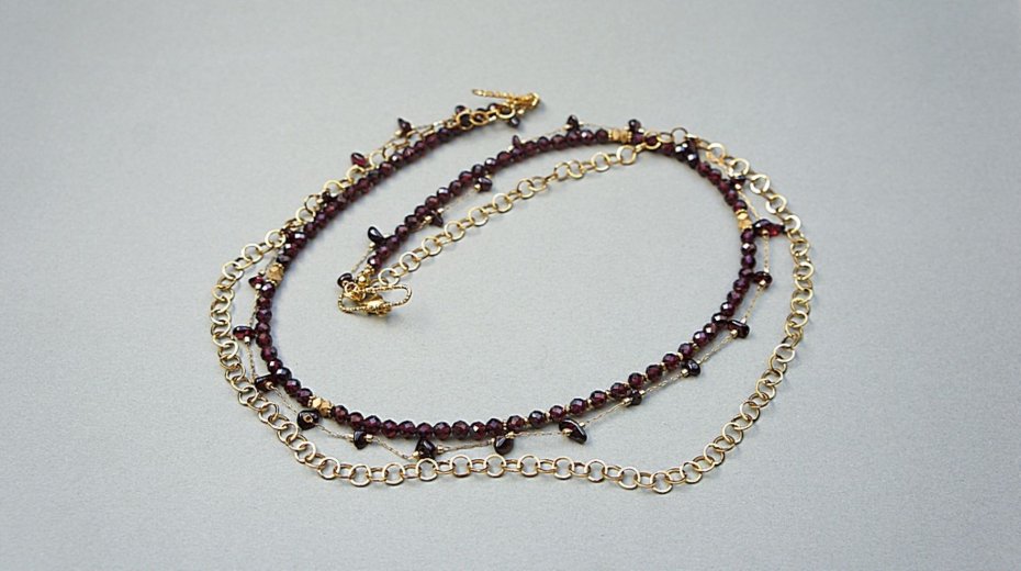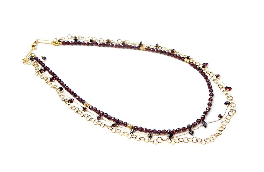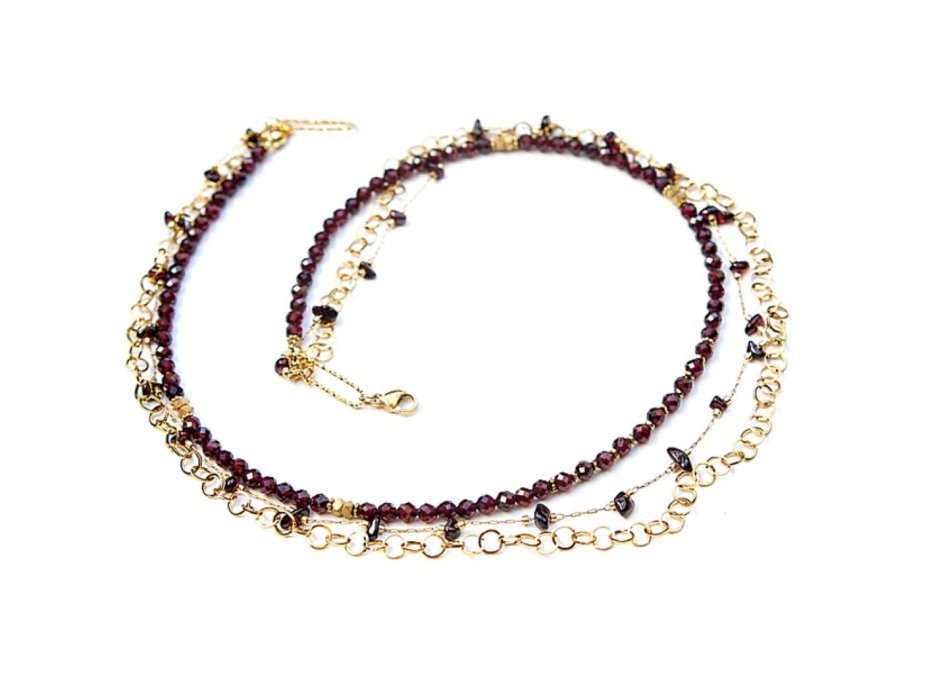 Potrójny naszyjnik wykonany w całości z pozłacanej stali szlachetnej oraz naturalnych, szlachetnych kamieni - fasetowane kuleczki granatu [4mm], bryłki granatu [ok. 5 - 8mm] oraz przekładek z hematytu [3 x 2mm i 1mm]. Naszyjniki o długości ok. 47cm, 52,5cm i 54,5cm.