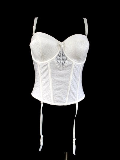 Piękny gorset firmy Triumph.Rozmiar 75D.Materiał syntetyk.Zapinany z tyłu na trzech szerokościach na haftki.Usztywniany w ośmiu miejscach.Z przodu wstawka z koronki.Ramiączka regulowane,odpinane.W dole paski do pończoch,można odczepić.Stan idealny,ubrany tylko raz do sukni ślubnej.